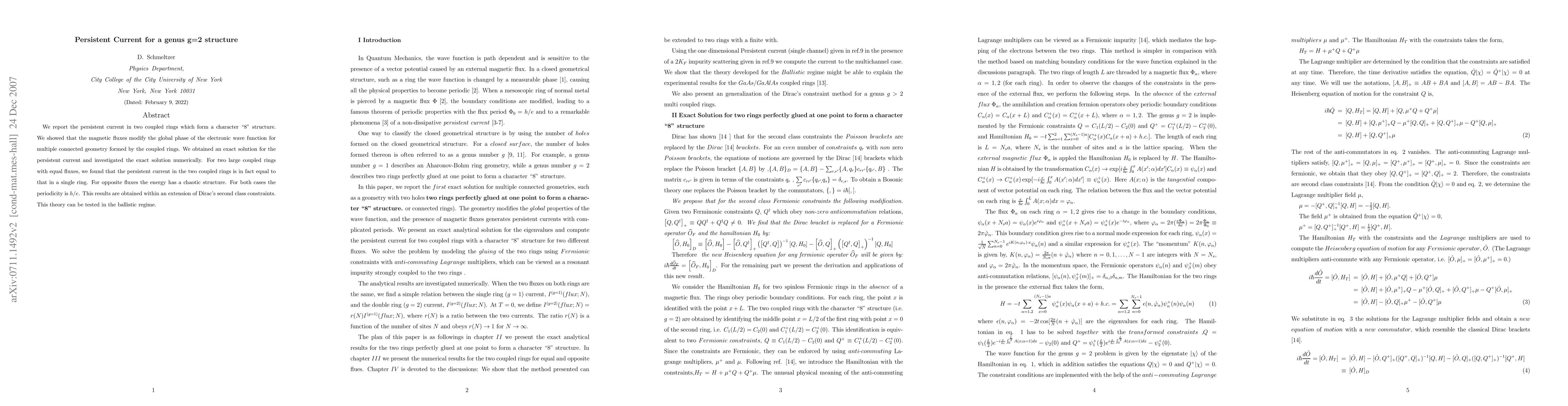 We report the first calculation of persistent current in two coupled rings which form a character ``8'' genus g=2 structure. We obtain an exact solution for the persistent current and investigated the exact solution numerically. For two large coupled rings with equal fluxes, we find that the persistent current in the two coupled rings is equal to that in a single ring. For opposite fluxes the energy has a chaotic structure. For both cases the periodicity is $h/e$. This results are obtained within an extension of Dirac's second class method to fermionic constraints. This theory can be tested in the ballistic regime.