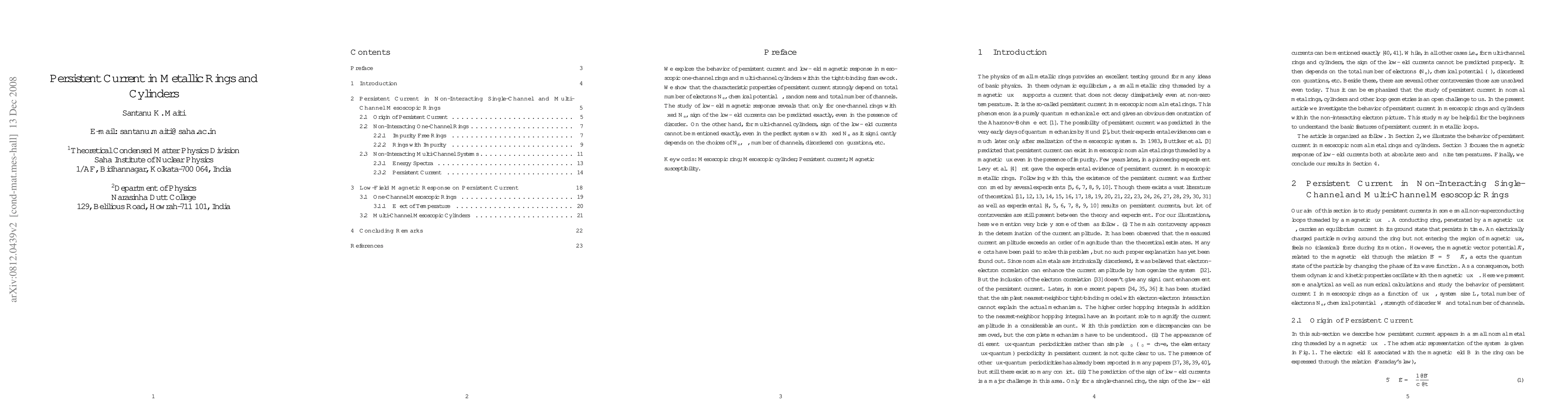This paper investigates the persistent current behavior in mesoscopic metallic rings and cylinders, finding that its properties depend on electron count, chemical potential, randomness, and channel number. For one-channel rings, low-field current signs can be precisely predicted, while for multi-channel cylinders, this is not possible due to dependencies on various factors.