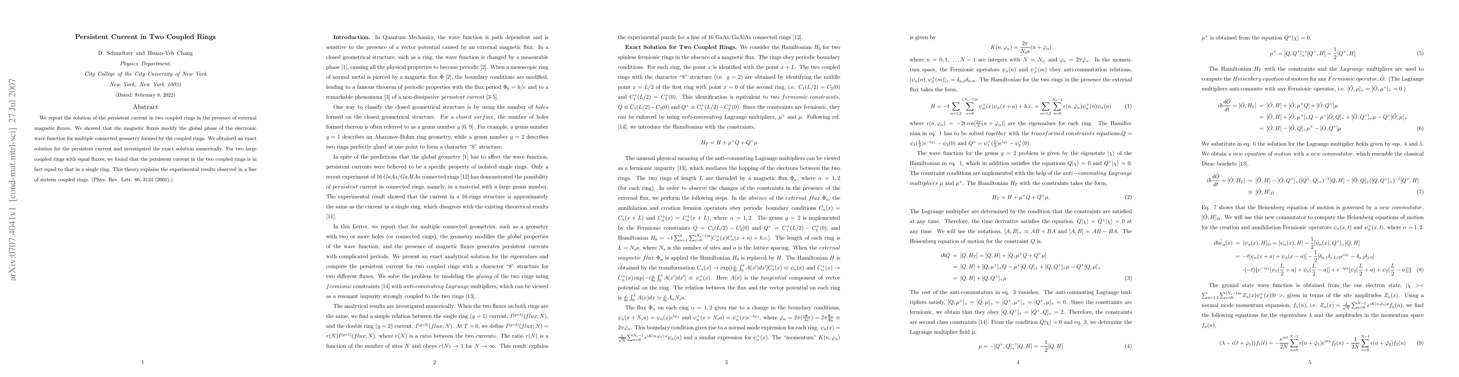 This paper presents an exact solution for the persistent current in two coupled rings under external magnetic fluxes, demonstrating that the fluxes modify the global phase of the electronic wave function. The study reveals that for large rings with equal fluxes, the persistent current in the coupled rings equals that in a single ring, aligning with experimental observations in a series of sixteen coupled rings.