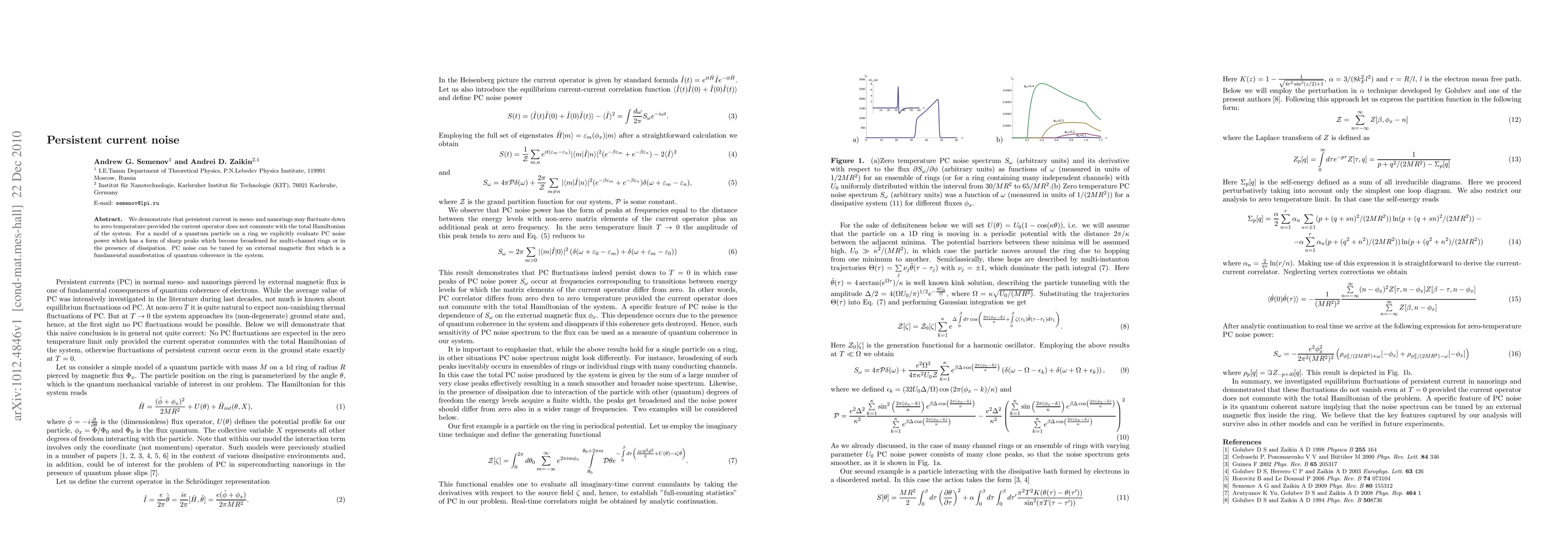 This paper shows that persistent current in meso- and nanorings can fluctuate even at zero temperature if the current operator does not commute with the system's total Hamiltonian. The study evaluates the noise power, revealing sharp peaks that broaden with multi-channel rings or dissipation, and demonstrates tuning via external magnetic flux as a quantum coherence manifestation.
