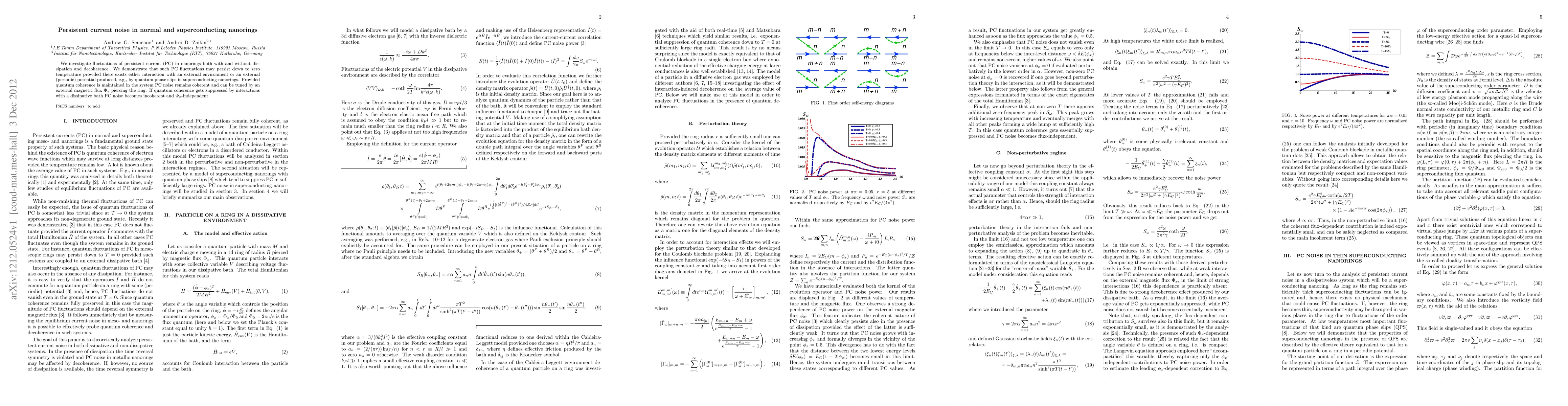 This paper examines persistent current fluctuations in nanorings, showing that noise persists even at zero temperature due to interactions with the environment or quantum phase slips. Coherent noise can be tuned by an external magnetic flux, while incoherent noise occurs when quantum coherence is lost due to dissipation.