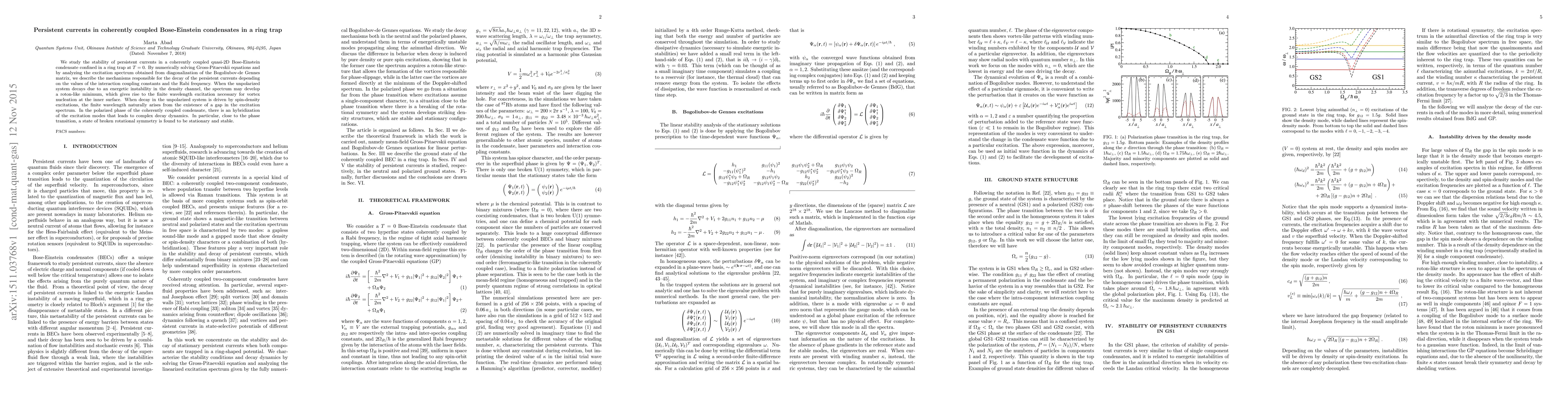 This paper investigates the stability of persistent currents in a coherently coupled quasi-2D Bose-Einstein condensate in a ring trap, revealing mechanisms for current decay linked to interaction coupling and Rabi frequency. It finds that different decay processes lead to distinct excitation spectra, including roton-like minima and gap-driven finite wavelengths, with a stable state of broken rotational symmetry near phase transitions.