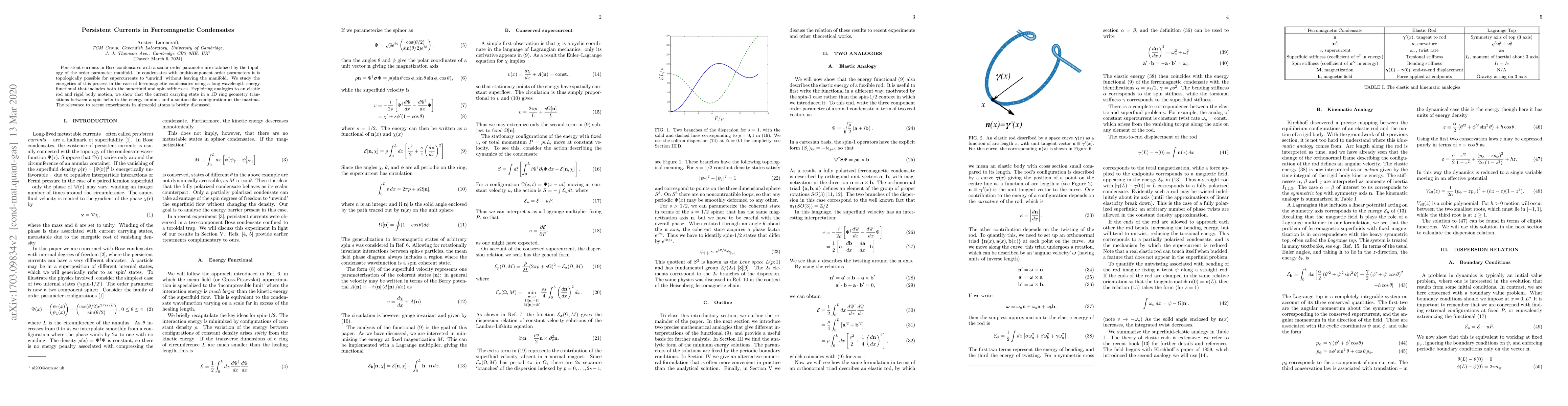 Persistent currents in Bose condensates with a scalar order parameter are stabilized by the topology of the order parameter manifold. In condensates with multicomponent order parameters it is topologically possible for supercurrents to `unwind' without leaving the manifold. We study the energetics of this process in the case of ferromagnetic condensates using a long wavelength energy functional that includes both the superfluid and spin stiffnesses. Exploiting analogies to an elastic rod and rigid body motion, we show that the current carrying state in a 1D ring geometry transitions between a spin helix in the energy minima and a soliton-like configuration at the maxima. The relevance to recent experiments in ultracold atoms is briefly discussed.