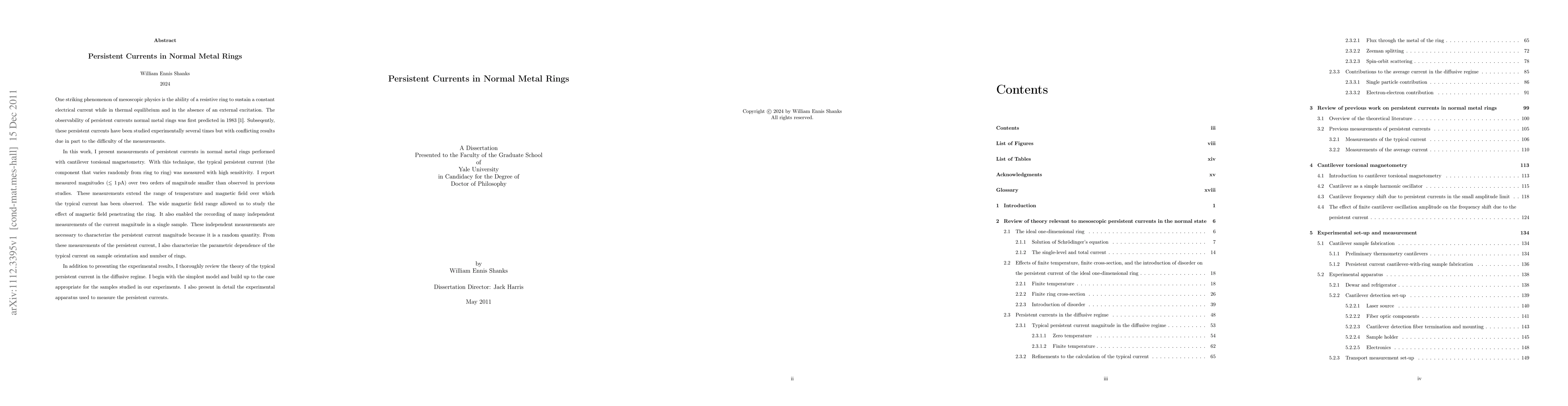 This research measures persistent currents in normal metal rings using cantilever torsional magnetometry, achieving sensitivities down to 1 pA and exploring their parametric dependence on sample orientation and ring number. The study also reviews the theoretical framework for the typical persistent current in the diffusive regime.