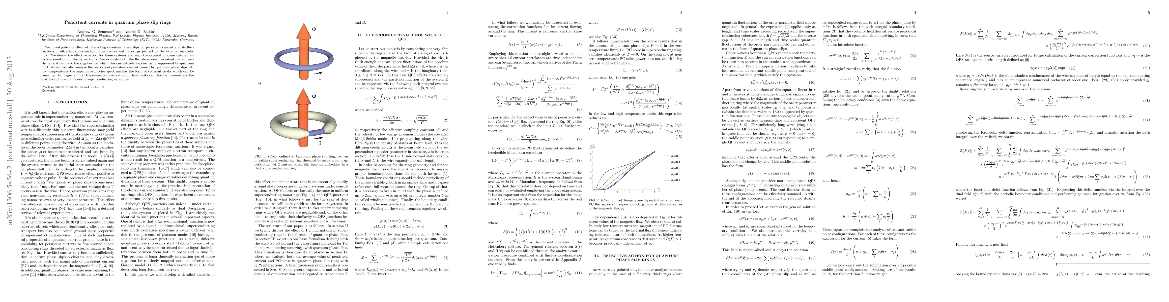 This paper studies the impact of quantum phase slips on persistent currents in ultrathin superconducting nanowires and nanorings, deriving an effective sine-Gordon theory and evaluating the flux-dependent persistent current and its critical suppression radius. It also examines current fluctuations due to quantum phase slips, revealing coherent noise peaks tunable by magnetic flux, which could be experimentally observed to confirm plasma modes in superconducting nanorings.