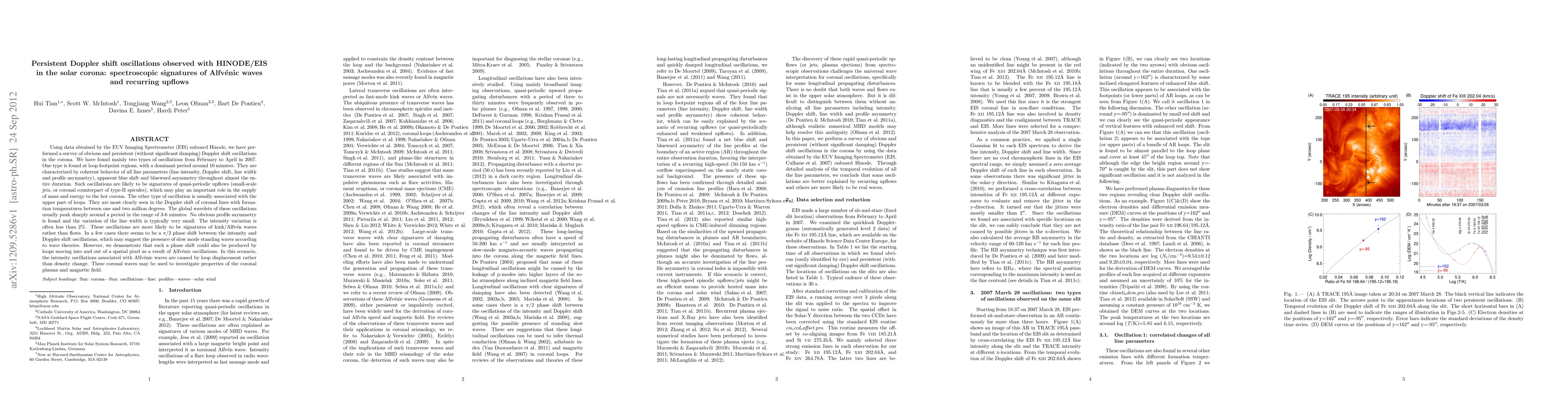 This study using Hinode/EIS data identifies two types of persistent Doppler shift oscillations in the solar corona: Alfvenic waves in upper loop regions and quasi-periodic upflows at loop footpoints, suggesting roles in mass and energy supply to the corona.