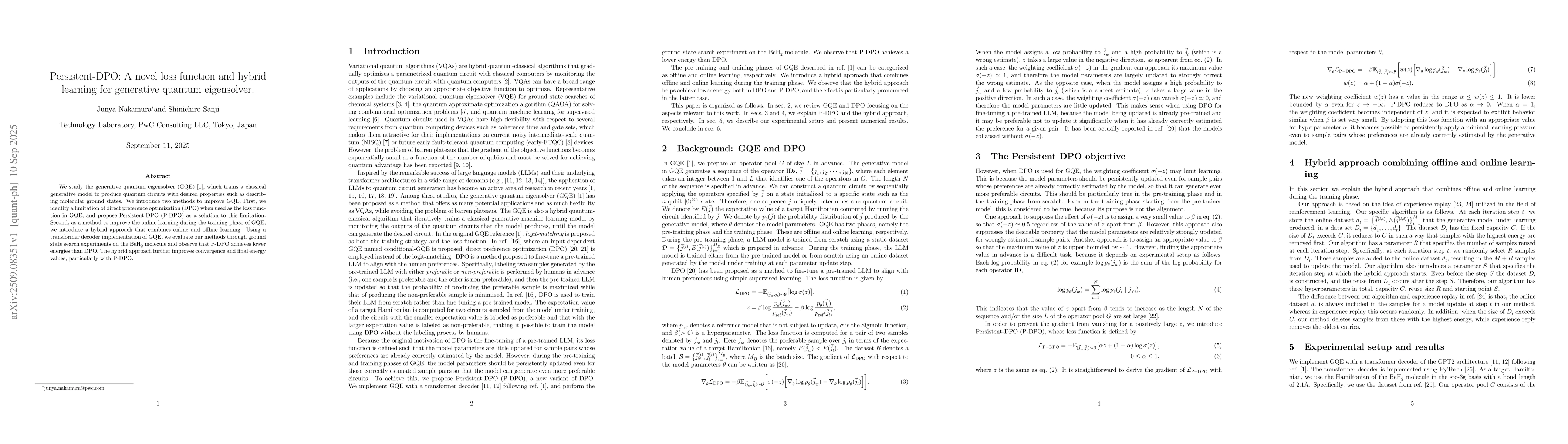 We study the generative quantum eigensolver (GQE)~\cite{nakaji2024generative}, which trains a classical generative model to produce quantum circuits with desired properties such as describing molecular ground states. We introduce two methods to improve GQE. First, we identify a limitation of direct preference optimization (DPO) when used as the loss function in GQE, and propose Persistent-DPO (P-DPO) as a solution to this limitation. Second, as a method to improve the online learning during the training phase of GQE, we introduce a hybrid approach that combines online and offline learning. Using a transformer decoder implementation of GQE, we evaluate our methods through ground state search experiments on the $\mathrm{BeH_2^{}}$ molecule and observe that P-DPO achieves lower energies than DPO. The hybrid approach further improves convergence and final energy values, particularly with P-DPO.