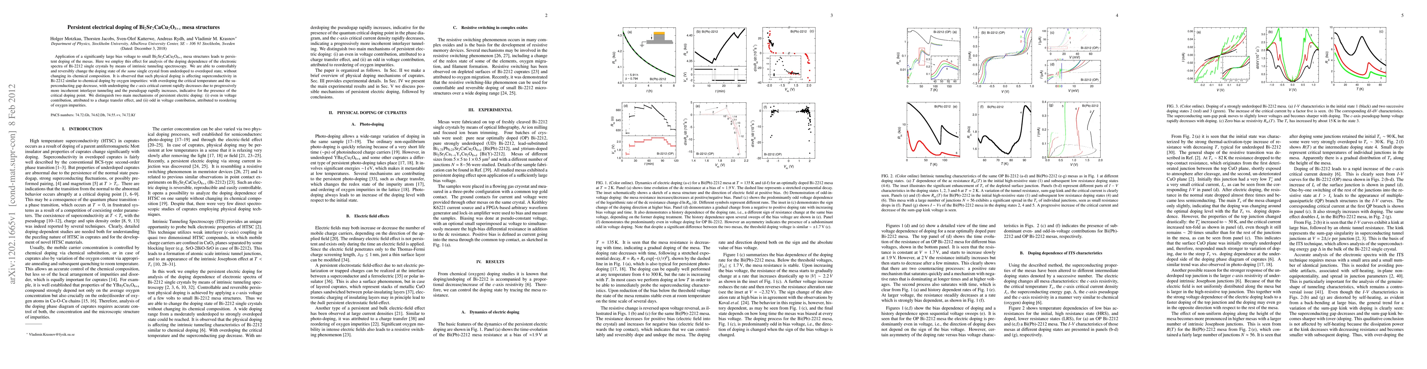 This paper investigates persistent electrical doping in Bi2Sr2CaCu2O8+x mesa structures via large bias voltages, enabling reversible changes in doping state without altering chemical composition. The study reveals that physical doping affects superconductivity similarly to chemical doping, highlighting the critical doping point and identifying two main doping mechanisms: charge transfer and oxygen impurity reordering.