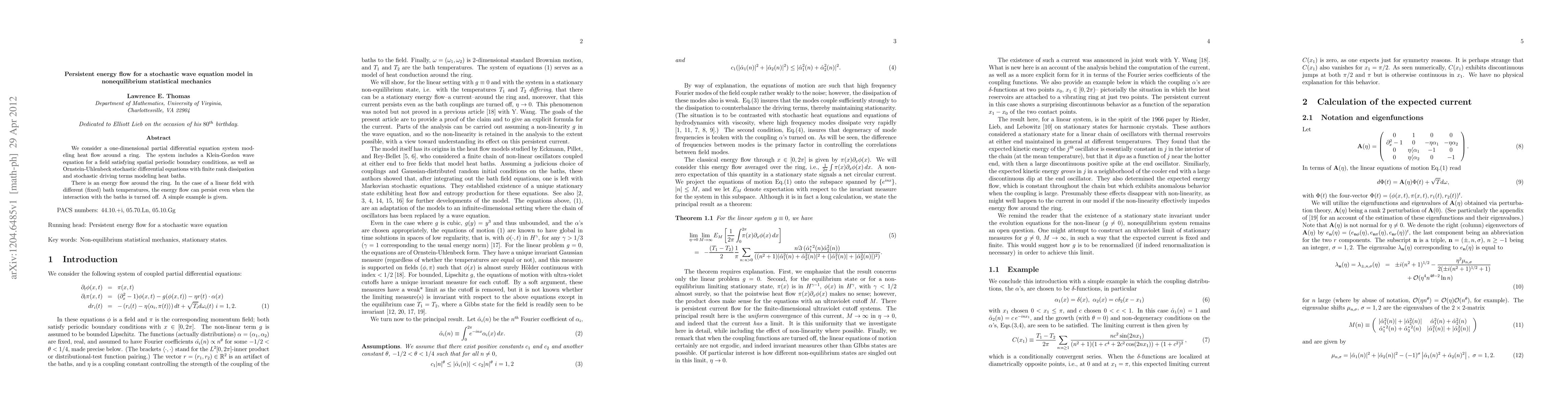 We consider a one-dimensional partial differential equation system modeling heat flow around a ring. The system includes a Klein-Gordon wave equation for a field satisfying spatial periodic boundary conditions, as well as Ornstein-Uhlenbeck stochastic differential equations with finite rank dissipation and stochastic driving terms modeling heat baths. There is an energy flow around the ring. In the case of a linear field with different (fixed) bath temperatures, the energy flow can persist even when the interaction with the baths is turned off. A simple example is given.