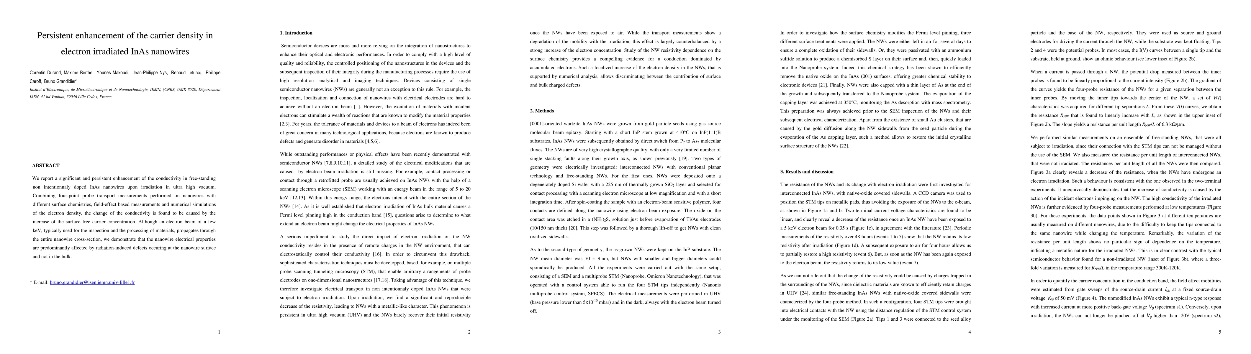 Electron irradiation of InAs nanowires increases conductivity due to radiation-induced surface defects, leading to a persistent enhancement in carrier density.