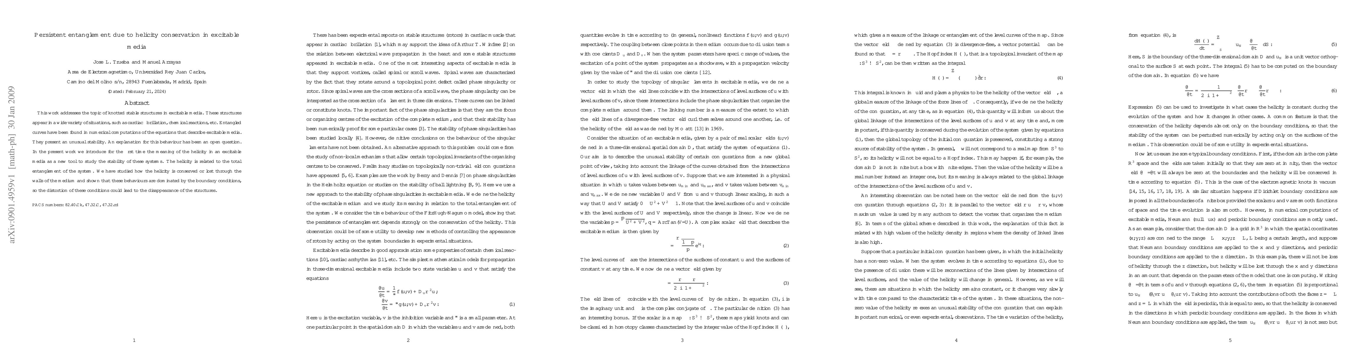 This paper explores the stability of knotted structures in excitable media, attributing their persistence to helicity conservation. The study reveals that boundary conditions significantly influence helicity conservation, which in turn affects the stability of these entangled structures.