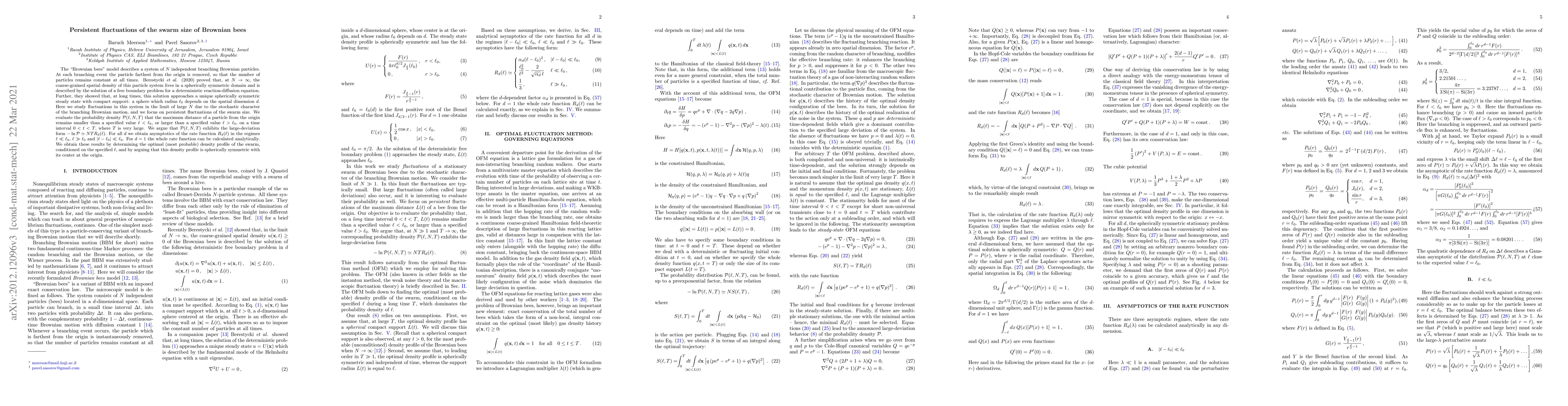 Researchers studied fluctuations in a swarm of Brownian bees, finding that their size persists with high probability over long times due to a unique steady state, while rare deviations occur near the edge of this state.