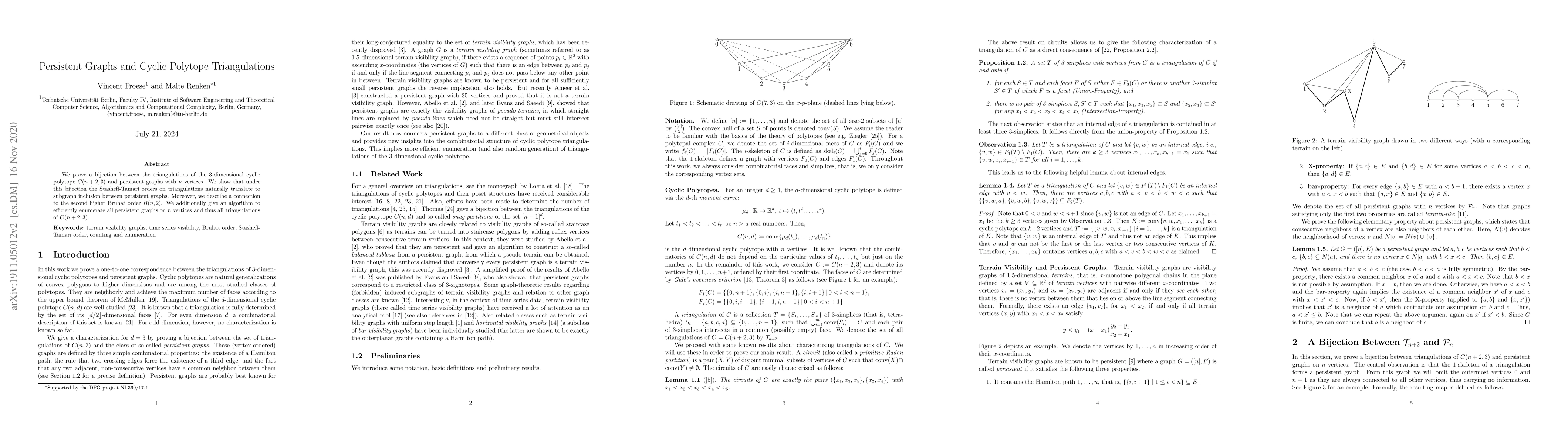 This paper establishes a bijection between the triangulations of the cyclic polytope C(n+2, 3) and persistent graphs with n vertices, showing that the Stasheff-Tamari orders correspond to subgraph inclusions. It also links this to the second higher Bruhat order B(n, 2) and provides an algorithm for enumerating all such persistent graphs.