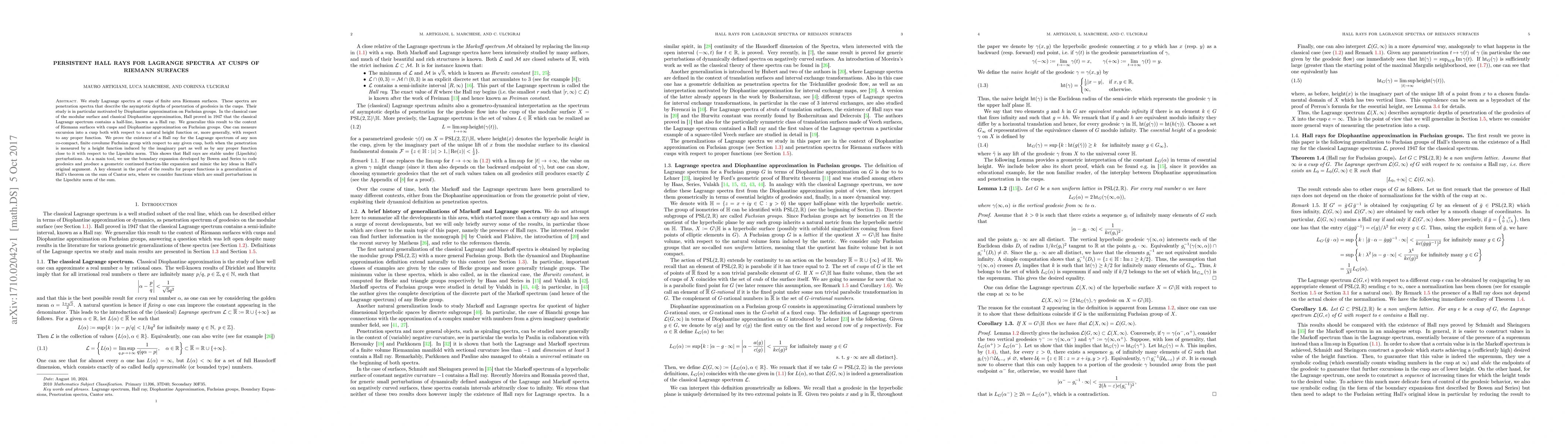 This paper generalizes Hall's 1947 result on Hall rays in the classical Lagrange spectrum to Riemann surfaces with cusps, proving the existence of a Hall ray for any non co-compact, finite covolume Fuchsian group. The study uses boundary expansion and geometric continued fraction-like expansions to demonstrate stability of Hall rays under Lipschitz perturbations.