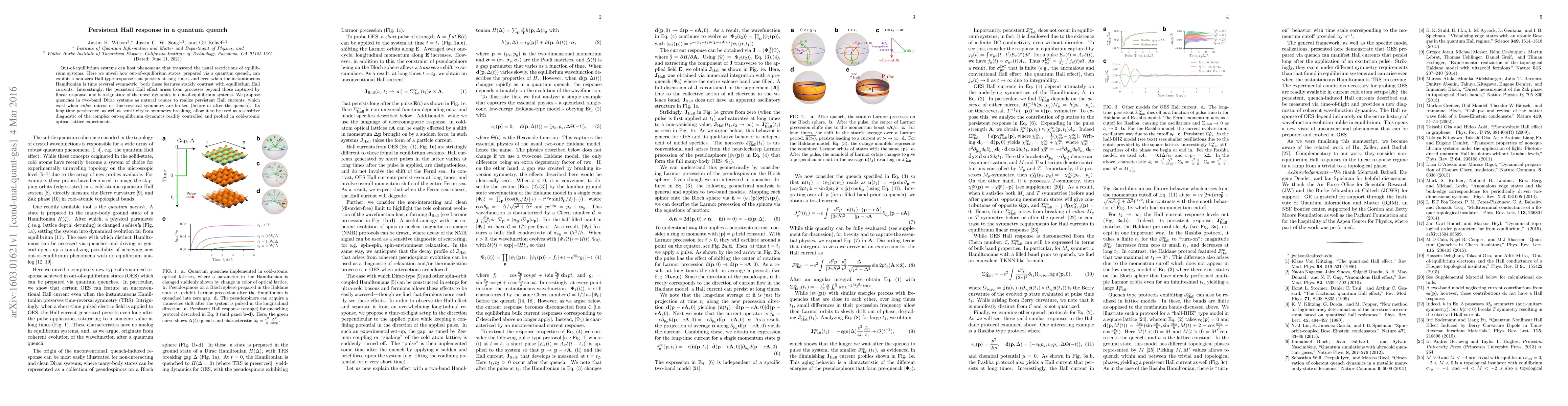 Out-of-equilibrium systems can host phenomena that transcend the usual restrictions of equilibrium systems. Here we unveil how out-of-equilibrium states, prepared via a quantum quench, can exhibit a non-zero Hall-type response that persists at long times, and even when the instantaneous Hamiltonian is time reversal symmetric; both these features starkly contrast with equilibrium Hall currents. Interestingly, the persistent Hall effect arises from processes beyond those captured by linear response, and is a signature of the novel dynamics in out-of-equilibrium systems. We propose quenches in two-band Dirac systems as natural venues to realize persistent Hall currents, which exist when either mirror or time-reversal symmetry are broken (before or after the quench). Its long time persistence, as well as sensitivity to symmetry breaking, allow it to be used as a sensitive diagnostic of the complex out-equilibrium dynamics readily controlled and probed in cold-atomic optical lattice experiments.