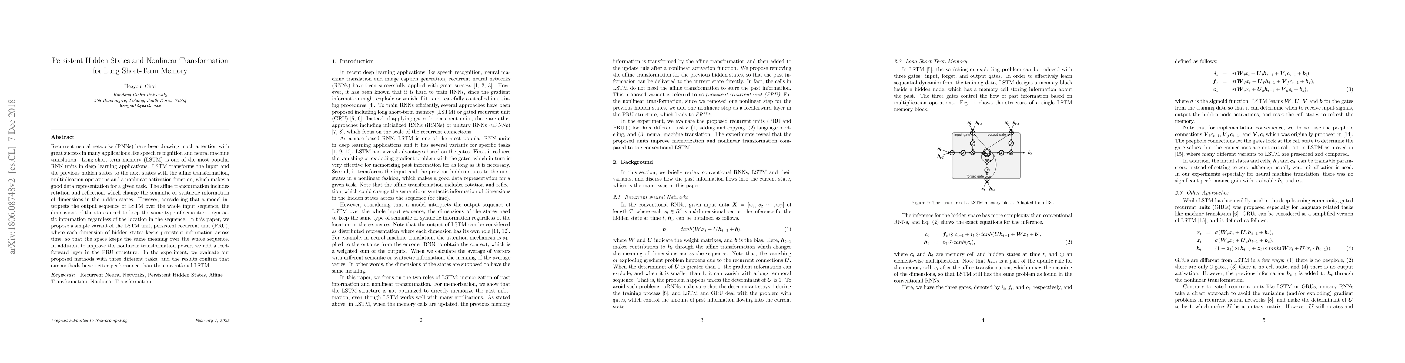 Recurrent neural networks (RNNs) have been drawing much attention with great success in many applications like speech recognition and neural machine translation. Long short-term memory (LSTM) is one of the most popular RNN units in deep learning applications. LSTM transforms the input and the previous hidden states to the next states with the affine transformation, multiplication operations and a nonlinear activation function, which makes a good data representation for a given task. The affine transformation includes rotation and reflection, which change the semantic or syntactic information of dimensions in the hidden states. However, considering that a model interprets the output sequence of LSTM over the whole input sequence, the dimensions of the states need to keep the same type of semantic or syntactic information regardless of the location in the sequence. In this paper, we propose a simple variant of the LSTM unit, persistent recurrent unit (PRU), where each dimension of hidden states keeps persistent information across time, so that the space keeps the same meaning over the whole sequence. In addition, to improve the nonlinear transformation power, we add a feedforward layer in the PRU structure. In the experiment, we evaluate our proposed methods with three different tasks, and the results confirm that our methods have better performance than the conventional LSTM.