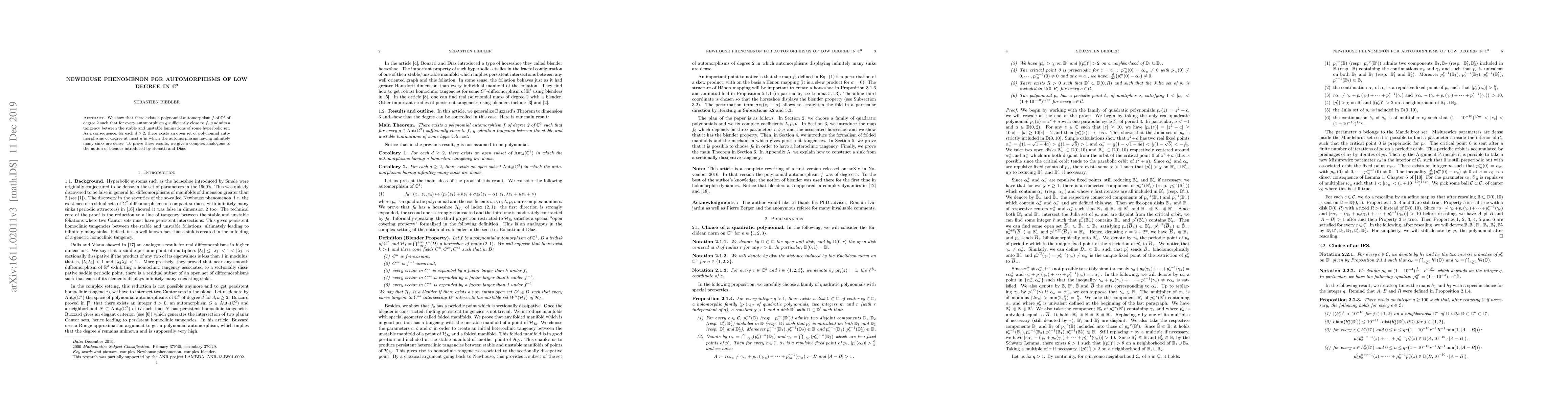 Summary: The paper demonstrates that a degree 2 polynomial automorphism in $\mathbb{C}^{3}$ can generate nearby automorphisms with persistent homoclinic tangencies, leading to dense open sets of low-degree polynomial automorphisms containing those with infinitely many sinks. The proof utilizes a complex blender concept akin to Bonatti and Diaz's notion.
