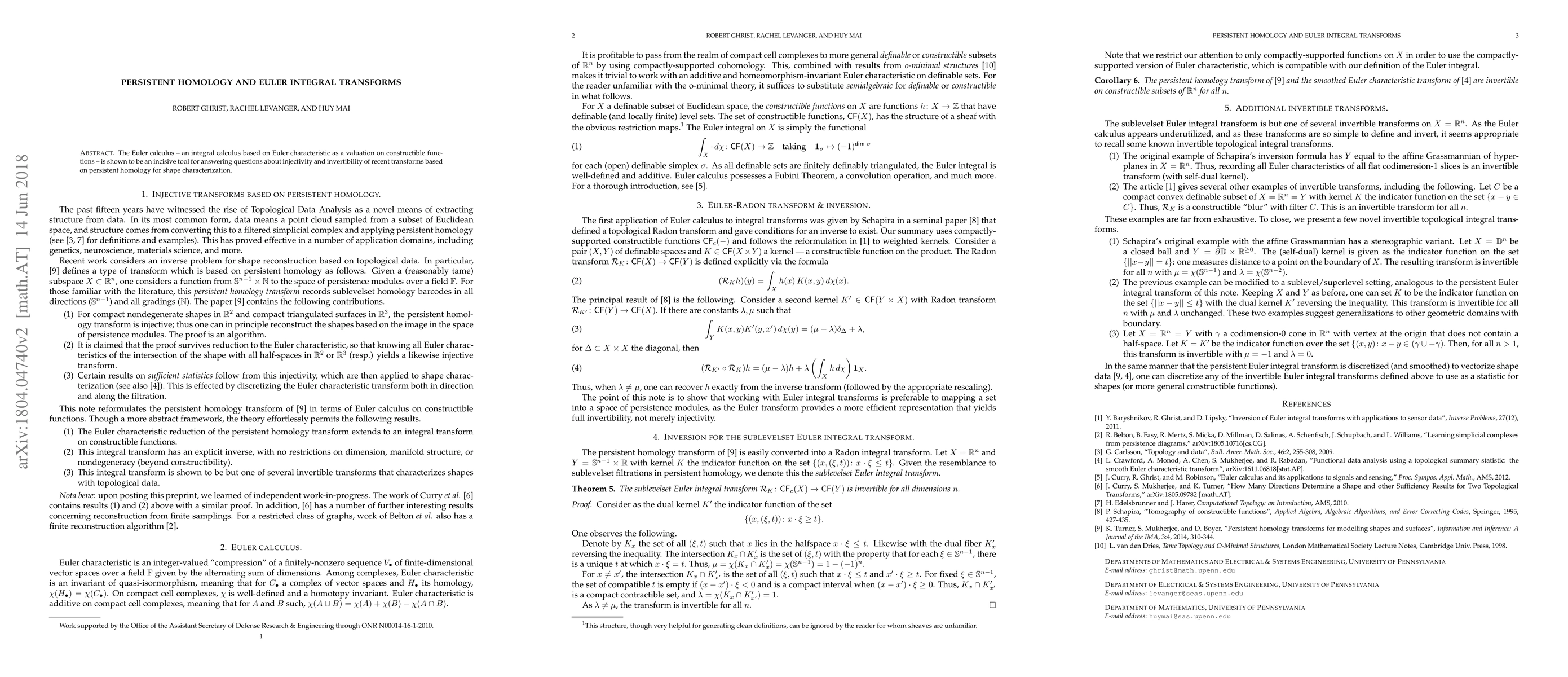 Summary: This paper demonstrates the utility of Euler calculus in assessing the injectivity and invertibility of transforms derived from persistent homology, providing a robust framework for shape characterization. The Euler characteristic serves as a valuable valuation in this context.