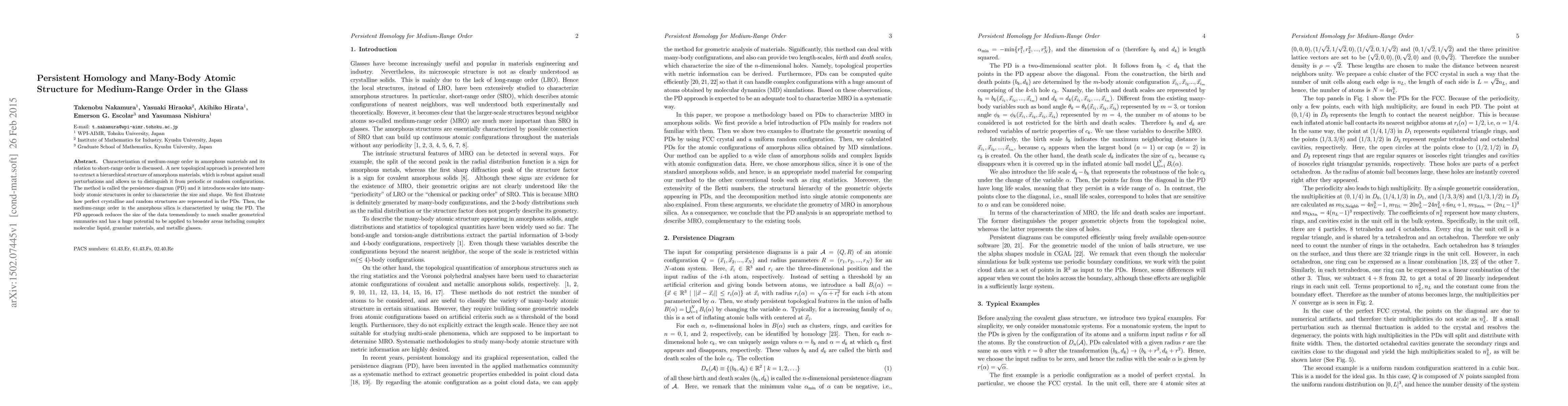 Characterization of medium-range order in amorphous materials and its relation to short-range order is discussed. A new topological approach is presented here to extract a hierarchical structure of amorphous materials, which is robust against small perturbations and allows us to distinguish it from periodic or random configurations. The method is called the persistence diagram (PD) and it introduces scales into many-body atomic structures in order to characterize the size and shape. We first illustrate how perfect crystalline and random structures are represented in the PDs. Then, the medium-range order in the amorphous silica is characterized by using the PD. The PD approach reduces the size of the data tremendously to much smaller geometrical summaries and has a huge potential to be applied to broader areas including complex molecular liquid, granular materials, and metallic glasses.