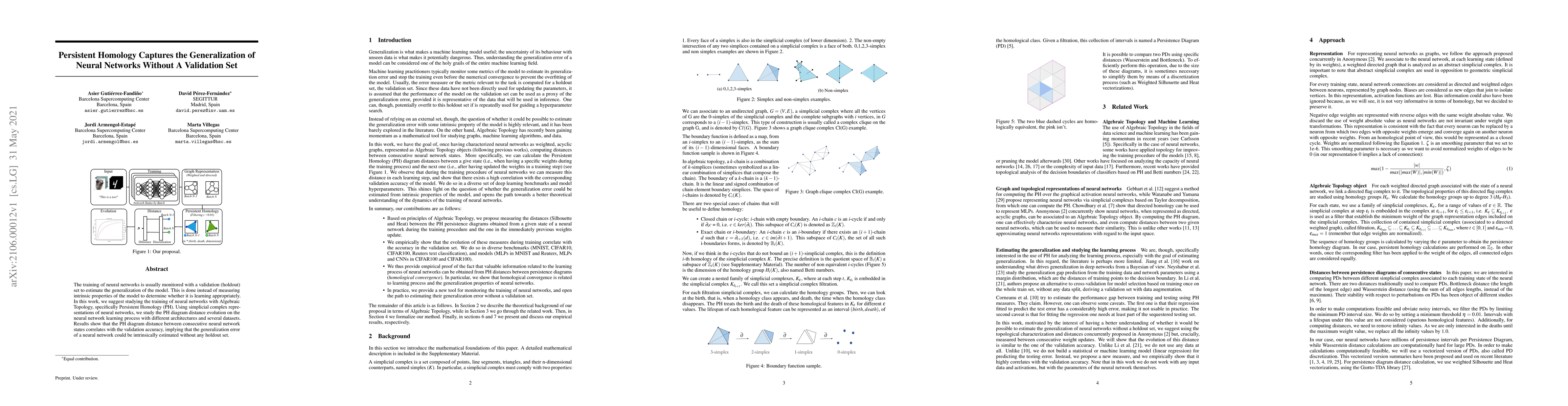 The training of neural networks is usually monitored with a validation (holdout) set to estimate the generalization of the model. This is done instead of measuring intrinsic properties of the model to determine whether it is learning appropriately. In this work, we suggest studying the training of neural networks with Algebraic Topology, specifically Persistent Homology (PH). Using simplicial complex representations of neural networks, we study the PH diagram distance evolution on the neural network learning process with different architectures and several datasets. Results show that the PH diagram distance between consecutive neural network states correlates with the validation accuracy, implying that the generalization error of a neural network could be intrinsically estimated without any holdout set.