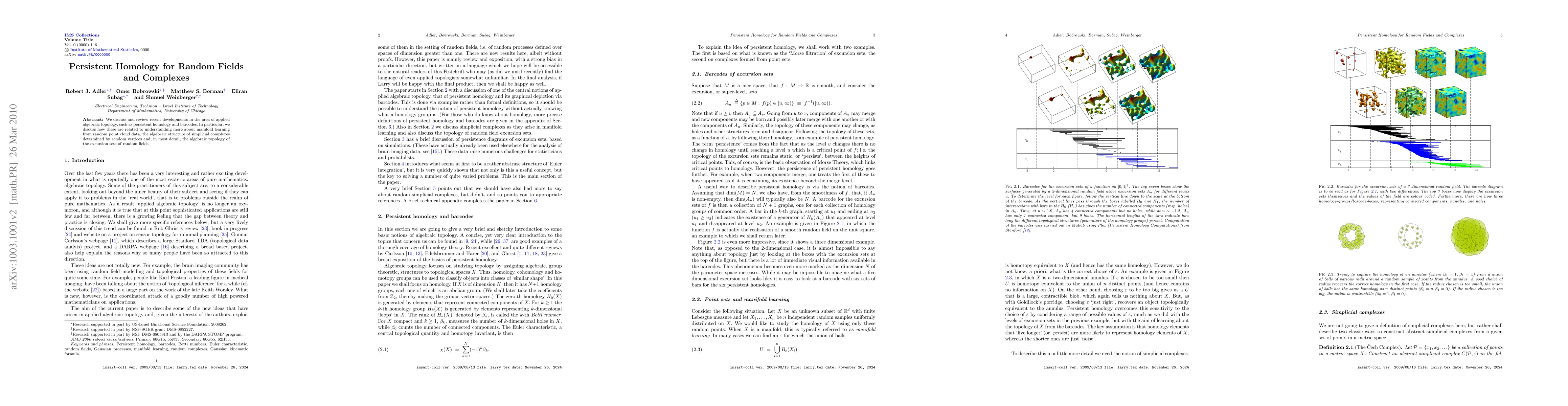 Summary: This paper reviews recent advancements in applied algebraic topology, focusing on persistent homology and its application to manifold learning from random point clouds, the algebraic structure of simplicial complexes, and the topology of random field excursion sets. It highlights the utility of these methods in analyzing complex data structures.