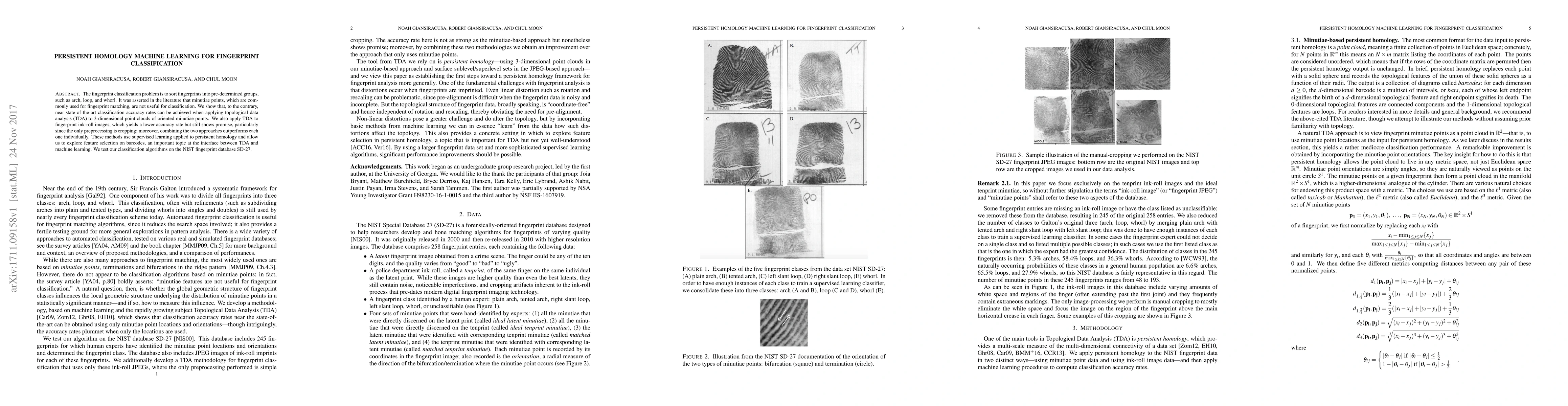 This paper explores the use of topological data analysis (TDA) for fingerprint classification, demonstrating that oriented minutiae points, when analyzed through persistent homology, achieve near state-of-the-art accuracy. Combining TDA of 3D point clouds and ink-roll images further enhances classification performance, showcasing the synergy between TDA and machine learning.
