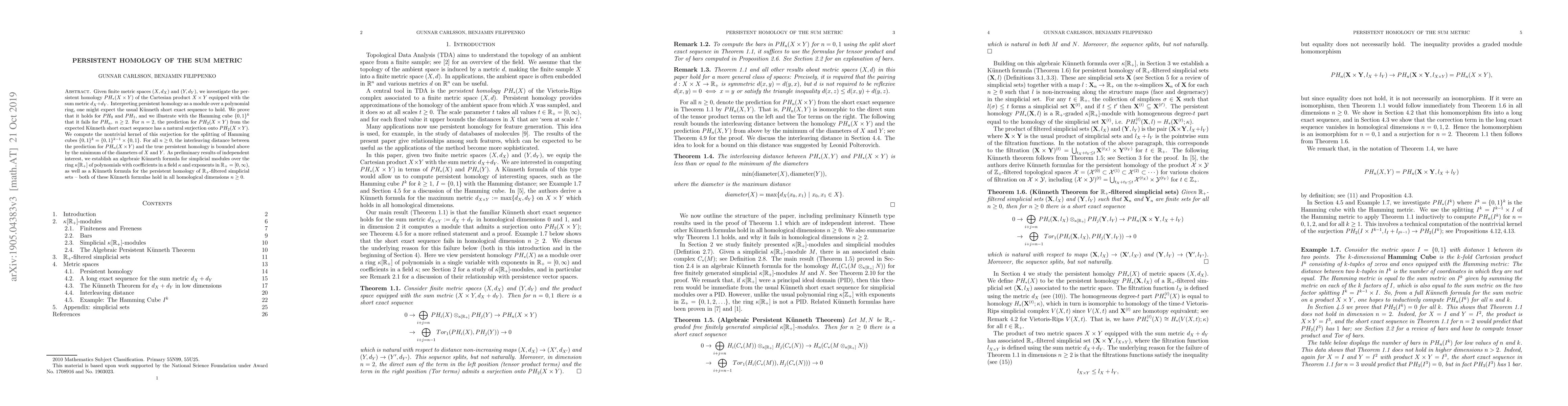 Given finite metric spaces $(X, d_X)$ and $(Y, d_Y)$, we investigate the persistent homology $PH_*(X \times Y)$ of the Cartesian product $X \times Y$ equipped with the sum metric $d_X + d_Y$. Interpreting persistent homology as a module over a polynomial ring, one might expect the usual K\"unneth short exact sequence to hold. We prove that it holds for $PH_0$ and $PH_1$, and we illustrate with the Hamming cube $\{0,1\}^k$ that it fails for $PH_n,\,\, n \geq 2$. For $n = 2$, the prediction for $PH_2(X \times Y)$ from the expected K\"unneth short exact sequence has a natural surjection onto $PH_2(X \times Y)$. We compute the nontrivial kernel of this surjection for the splitting of Hamming cubes $\{0,1\}^k = \{0,1\}^{k-1} \times \{0,1\}$. For all $n \geq 0$, the interleaving distance between the prediction for $PH_n(X \times Y)$ and the true persistent homology is bounded above by the minimum of the diameters of $X$ and $Y$. As preliminary results of independent interest, we establish an algebraic K\"unneth formula for simplicial modules over the ring $\kappa[\mathbb{R}_+]$ of polynomials with coefficients in a field $\kappa$ and exponents in $\mathbb{R}_+ = [0,\infty)$, as well as a K\"unneth formula for the persistent homology of $\mathbb{R}_+$-filtered simplicial sets -- both of these K\"unneth formulas hold in all homological dimensions $n \geq 0$.