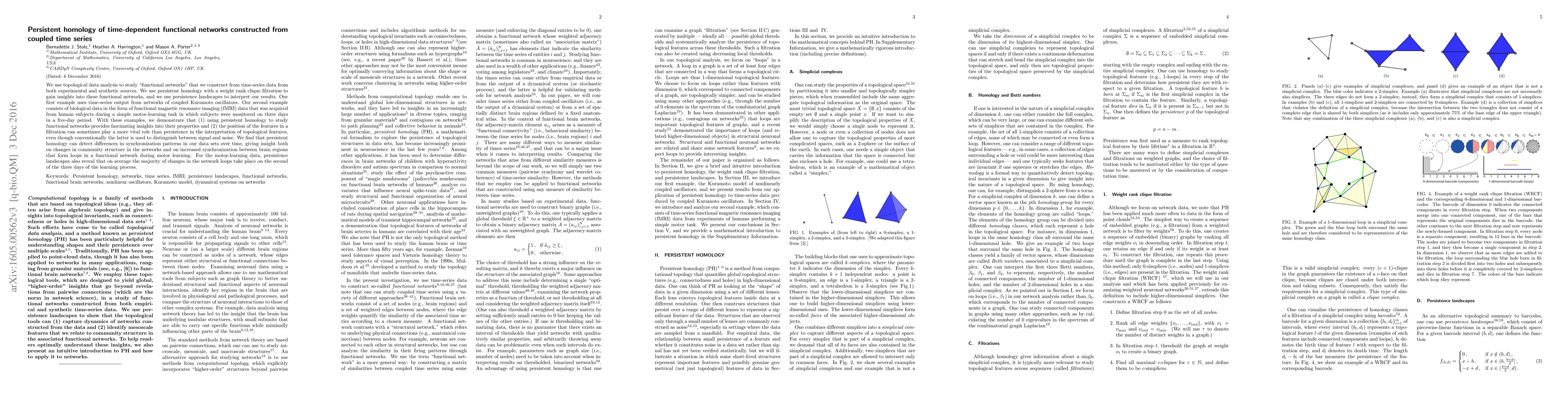 This paper applies persistent homology to analyze time-dependent functional networks derived from coupled time series, including synthetic and fMRI data. It demonstrates that persistent homology can reveal synchronization patterns and changes in community structure, highlighting the importance of filtration feature positioning over mere persistence in interpreting topological features.