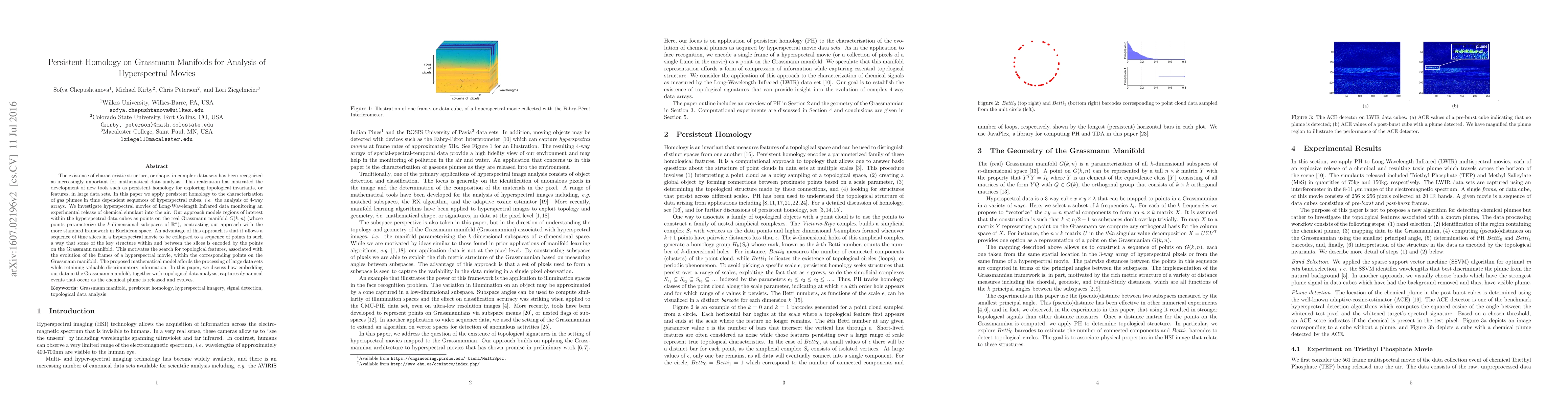 This paper applies persistent homology on Grassmann manifolds to analyze hyperspectral movies, modeling gas plumes in time-dependent sequences of hyperspectral cubes. The approach captures dynamical events in chemical plumes by encoding time slices as points on the Grassmann manifold, offering a powerful method for processing large data sets.