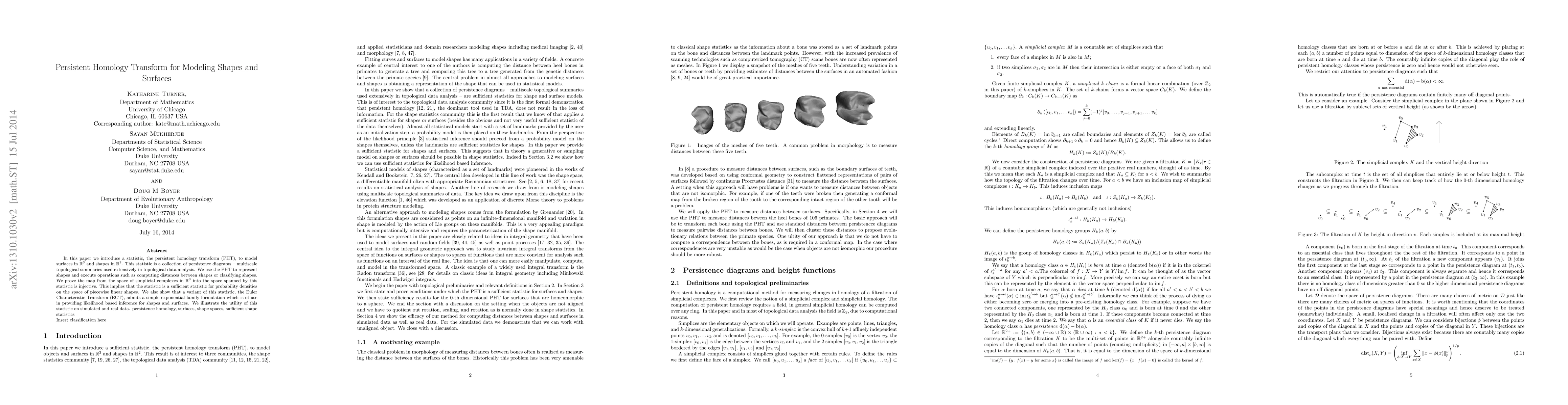 Researchers introduce a new statistic called Persistent Homology Transform (PHT) to model shapes and surfaces in 3D and 2D spaces, proving it's a sufficient tool for probability densities on piecewise linear shapes.