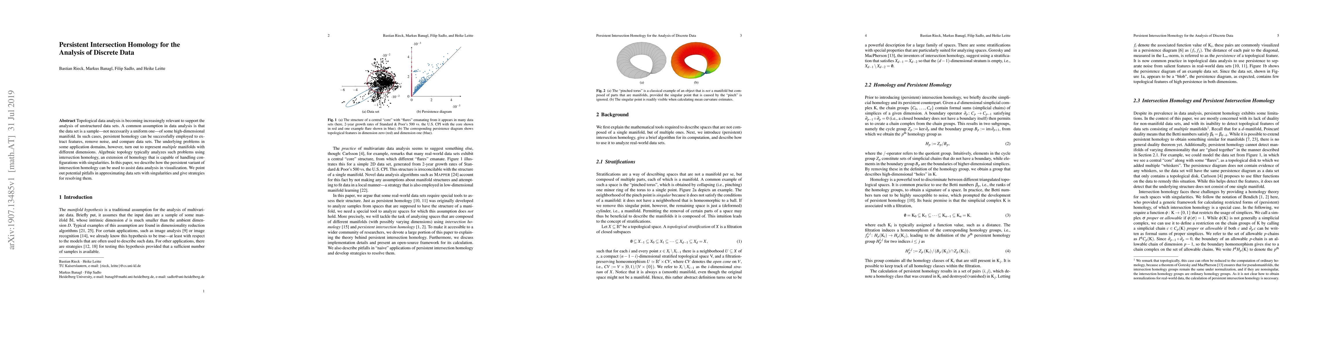 Topological data analysis is becoming increasingly relevant to support the analysis of unstructured data sets. A common assumption in data analysis is that the data set is a sample---not necessarily a uniform one---of some high-dimensional manifold. In such cases, persistent homology can be successfully employed to extract features, remove noise, and compare data sets. The underlying problems in some application domains, however, turn out to represent multiple manifolds with different dimensions. Algebraic topology typically analyzes such problems using intersection homology, an extension of homology that is capable of handling configurations with singularities. In this paper, we describe how the persistent variant of intersection homology can be used to assist data analysis in visualization. We point out potential pitfalls in approximating data sets with singularities and give strategies for resolving them.