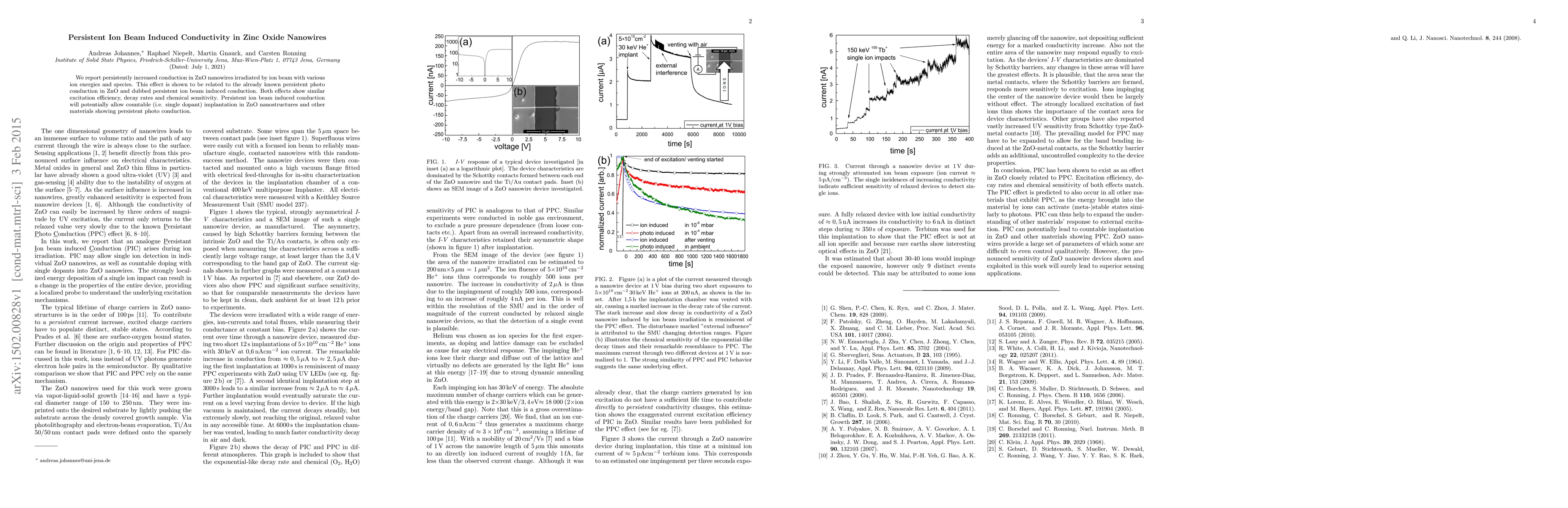 This study reveals persistently increased conductivity in zinc oxide nanowires following ion beam irradiation, akin to persistent photo conduction, suggesting potential for single dopant implantation in ZnO nanostructures. The effects share similar excitation efficiency, decay rates, and chemical sensitivity.