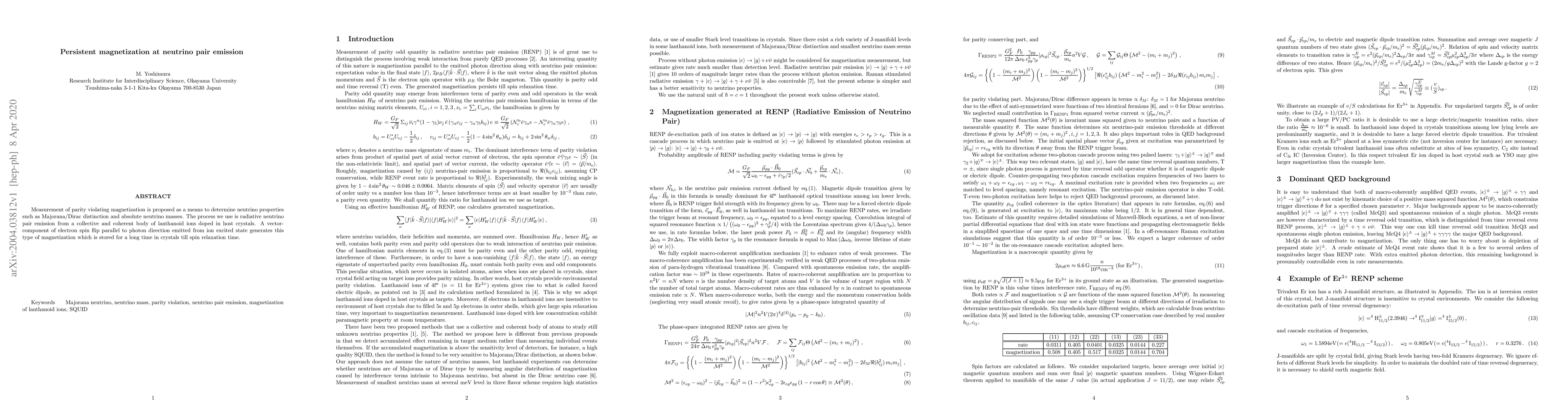Measurement of parity violating magnetization is proposed as a means to determine neutrino properties such as Majorana/Dirac distinction and absolute neutrino masses. The process we use is radiative neutrino pair emission from a collective and coherent body of lanthanoid ions doped in host crystals. A vector-component of electron spin flip parallel to photon direction emitted from ion excited state generates this type of magnetization which is stored for a long time in crystals till spin relaxation time.