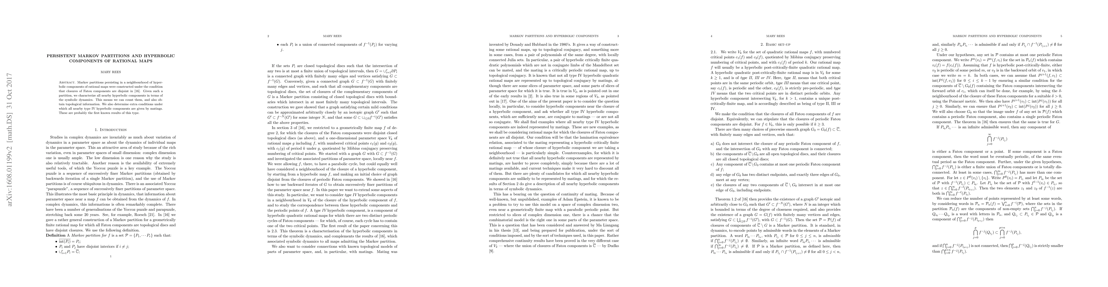 This paper constructs persistent Markov partitions near hyperbolic components of rational maps, characterizing nearby hyperbolic components via symbolic dynamics and counting them. It also identifies conditions for matings to generate type IV hyperbolic components.