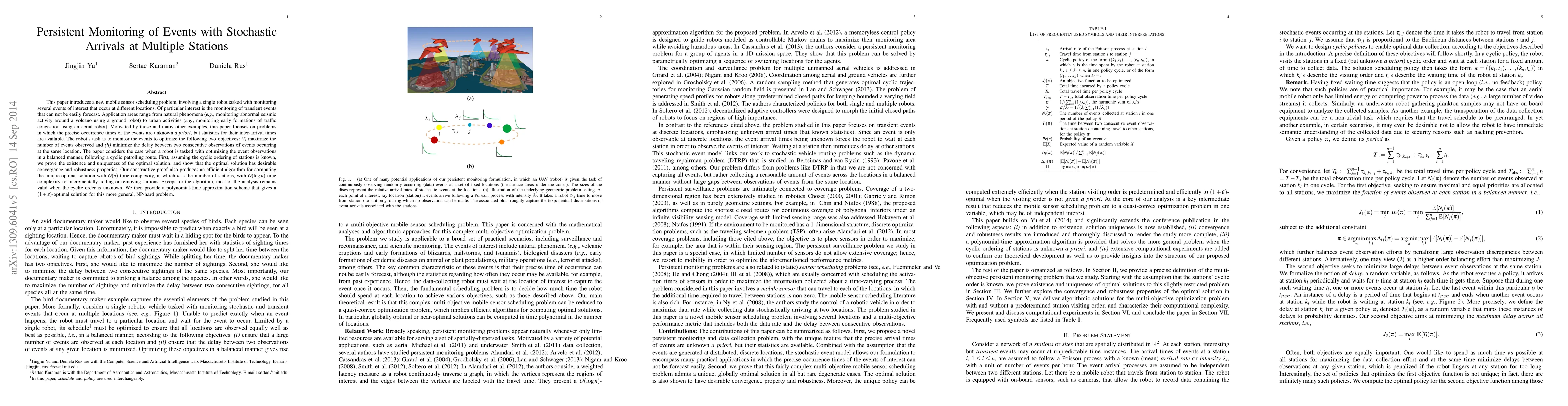 This paper introduces a new mobile sensor scheduling problem, involving a single robot tasked with monitoring several events of interest that occur at different locations. Of particular interest is the monitoring of transient events that can not be easily forecast. Application areas range from natural phenomena ({\em e.g.}, monitoring abnormal seismic activity around a volcano using a ground robot) to urban activities ({\em e.g.}, monitoring early formations of traffic congestion using an aerial robot). Motivated by those and many other examples, this paper focuses on problems in which the precise occurrence times of the events are unknown {\em a priori}, but statistics for their inter-arrival times are available. The robot's task is to monitor the events to optimize the following two objectives: {\em (i)} maximize the number of events observed and {\em (ii)} minimize the delay between two consecutive observations of events occurring at the same location. The paper considers the case when a robot is tasked with optimizing the event observations in a balanced manner, following a cyclic patrolling route. First, assuming the cyclic ordering of stations is known, we prove the existence and uniqueness of the optimal solution, and show that the optimal solution has desirable convergence and robustness properties. Our constructive proof also produces an efficient algorithm for computing the unique optimal solution with $O(n)$ time complexity, in which $n$ is the number of stations, with $O(\log n)$ time complexity for incrementally adding or removing stations. Except for the algorithm, most of the analysis remains valid when the cyclic order is unknown. We then provide a polynomial-time approximation scheme that gives a $(1+\epsilon)$-optimal solution for this more general, NP-hard problem.