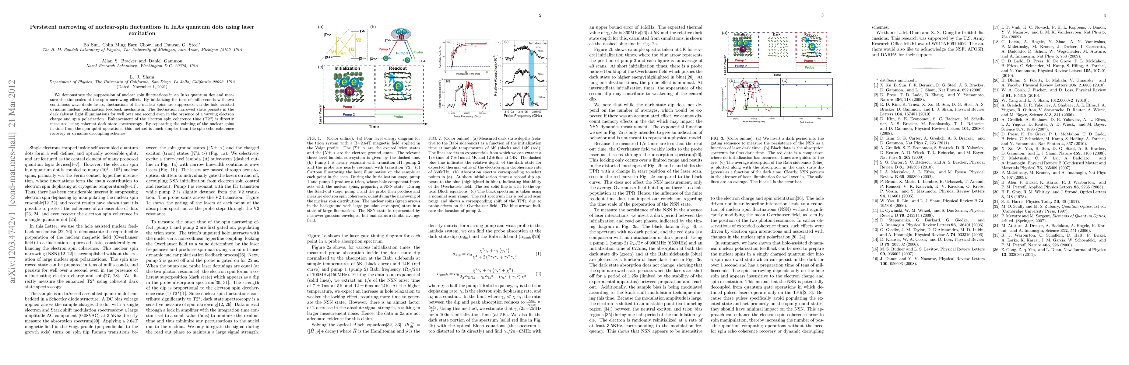 Researchers demonstrate a method to suppress nuclear spin fluctuations in InAs quantum dots using laser excitation, achieving persistent narrowing for over 1 second even without light illumination.