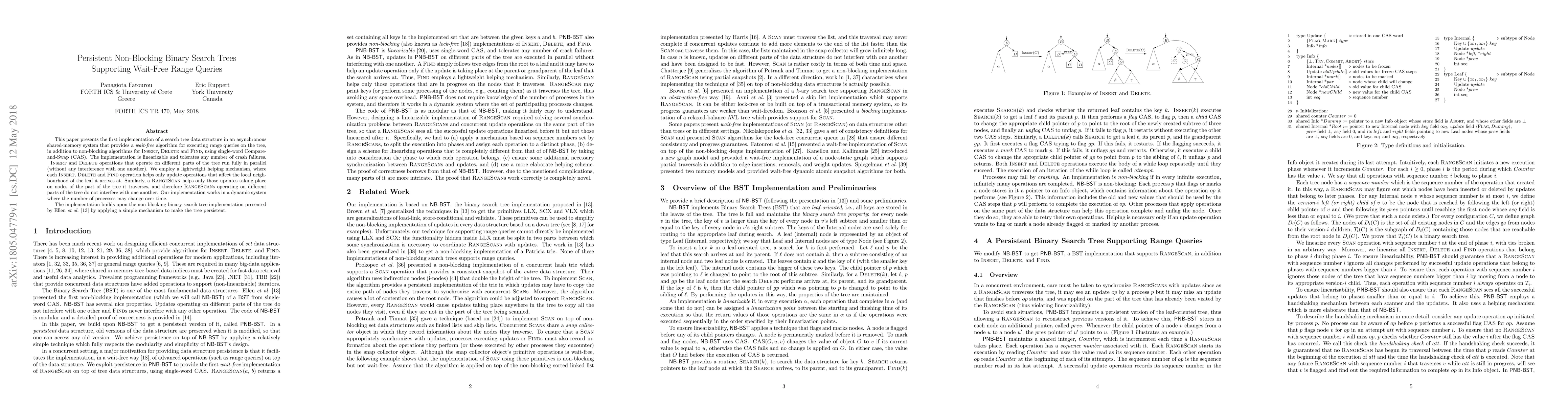 This paper introduces a persistent non-blocking binary search tree that supports wait-free range queries and non-blocking operations for Insert, Delete, and Find using Compare-and-Swap. The implementation is linearizable and tolerates crash failures, allowing fully parallel operations on different parts of the tree.