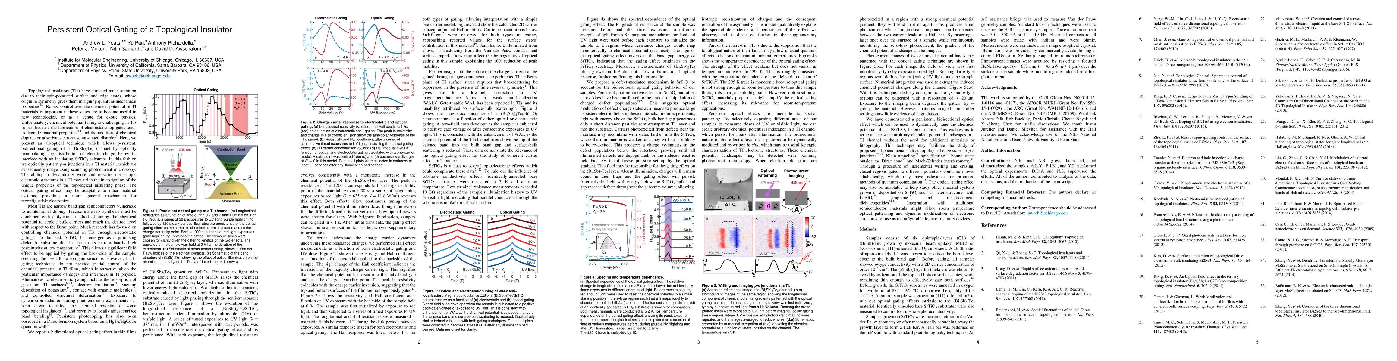 Topological insulators (TIs) have attracted much attention due to their spin-polarized surface and edge states, whose origin in symmetry gives them intriguing quantum-mechanical properties. Robust control over the chemical potential of TI materials is important if these states are to become useful in new technologies, or as a venue for exotic physics. Unfortunately, chemical potential tuning is challenging in TIs in part because the fabrication of electrostatic top-gates tends to degrade material properties and the addition of chemical dopants or adsorbates can cause unwanted disorder. Here, we present an all-optical technique which allows persistent, bidirectional gating of a (Bi,Sb)2Te3 channel by optically manipulating the distribution of electric charge below its interface with an insulating SrTiO3 substrate. In this fashion we optically pattern p-n junctions in a TI material, which we subsequently image using scanning photocurrent microscopy. The ability to dynamically write and re-write mesoscopic electronic structures in a TI may aid in the investigation of the unique properties of the topological insulating phase. The optical gating effect may be adaptable to other material systems, providing a more general mechanism for reconfigurable electronics.