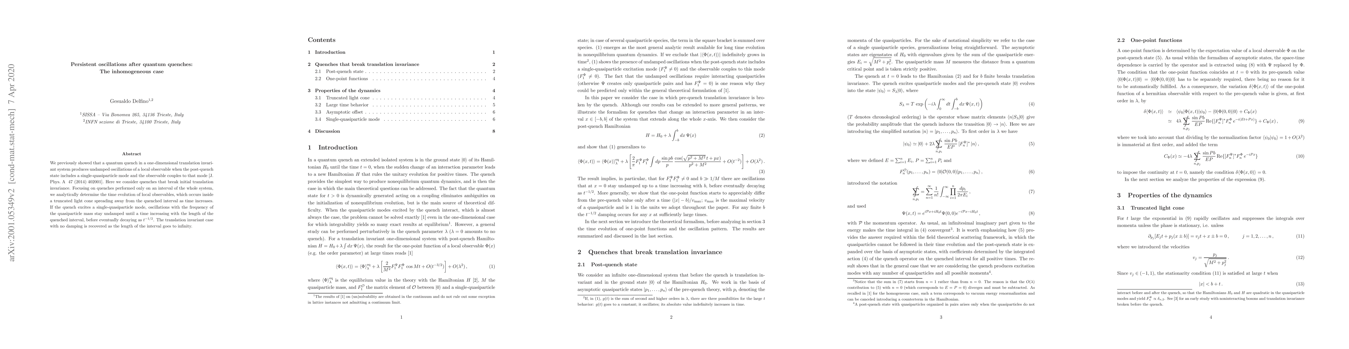 This paper extends previous research on quantum quenches, demonstrating that quenches breaking translation invariance produce undamped oscillations of local observables within a light cone spreading from the quenched interval. These oscillations persist until a time growing with the quenched interval length, eventually decaying as t^(-1/2). The translation-invariant case without damping is recovered as the quenched interval's length approaches infinity.