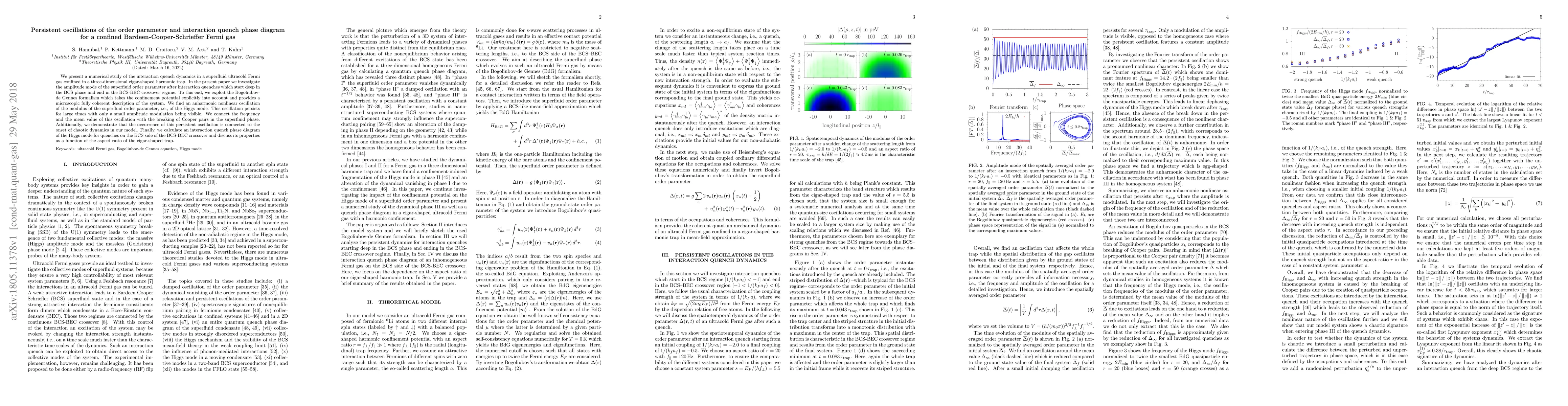 We present a numerical study of the interaction quench dynamics in a superfluid ultracold Fermi gas confined in a three-dimensional cigar-shaped harmonic trap. In the present paper we investigate the amplitude mode of the superfluid order parameter after interaction quenches which start deep in the BCS phase and end in the BCS-BEC crossover regime. To this end, we exploit the Bogoliubov-de Gennes formalism which takes the confinement potential explicitly into account and provides a microscopic fully coherent description of the system. We find an anharmonic nonlinear oscillation of the modulus of the superfluid order parameter, i.e., of the Higgs mode. This oscillation persists for large times with only a small amplitude modulation being visible. We connect the frequency and the mean value of this oscillation with the breaking of Cooper pairs in the superfluid phase. Additionally, we demonstrate that the occurrence of this persistent oscillation is connected to the onset of chaotic dynamics in our model. Finally, we calculate an interaction quench phase diagram of the Higgs mode for quenches on the BCS side of the BCS-BEC crossover and discuss its properties as a function of the aspect ratio of the cigar-shaped trap.