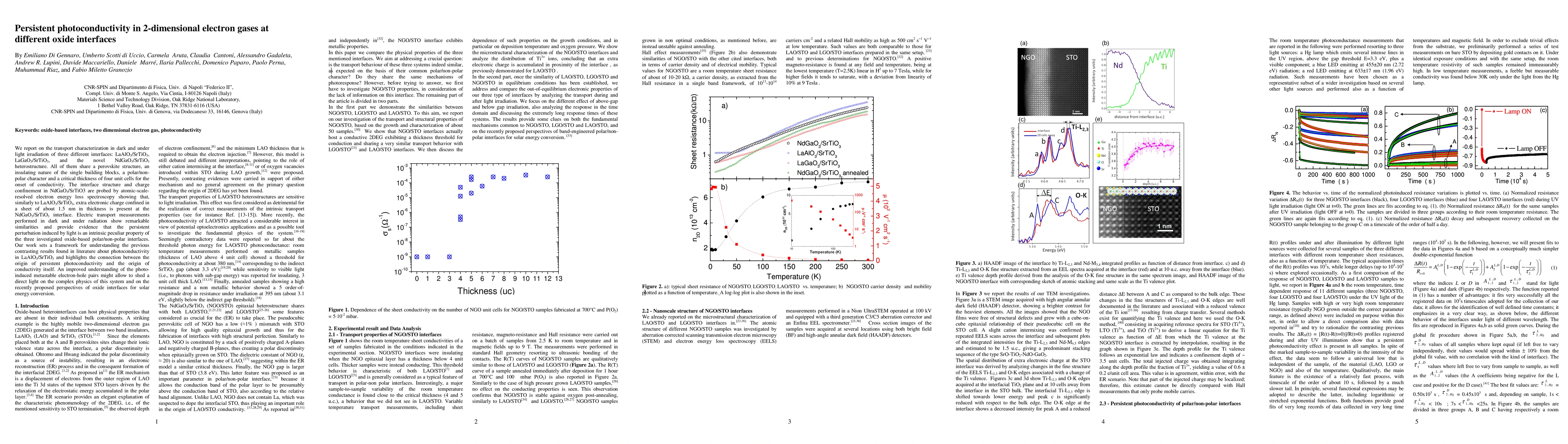 We report on the transport characterization in dark and under light irradiation of three different interfaces: LaAlO3/SrTiO3, LaGaO3/SrTiO3, and the novel NdGaO3/SrTiO3 heterostructure. All of them share a perovskite structure, an insulating nature of the single building blocks, a polar/non- polar character and a critical thickness of four unit cells for the onset of conductivity. The interface structure and charge confinement in NdGaO3/SrTiO3 are probed by atomic-scale- resolved electron energy loss spectroscopy showing that, similarly to LaAlO3/SrTiO3, extra electronic charge confined in a sheet of about 1.5 nm in thickness is present at the NdGaO3/SrTiO3 interface. Electric transport measurements performed in dark and under radiation show remarkable similarities and provide evidence that the persistent perturbation induced by light is an intrinsic peculiar property of the three investigated oxide-based polar/non-polar interfaces. Our work sets a framework for understanding the previous contrasting results found in literature about photoconductivity in LaAlO3/SrTiO3 and highlights the connection between the origin of persistent photoconductivity and the origin of conductivity itself. An improved understanding of the photo- induced metastable electron-hole pairs might allow to shed a direct light on the complex physics of this system and on the recently proposed perspectives of oxide interfaces for solar energy conversion.
