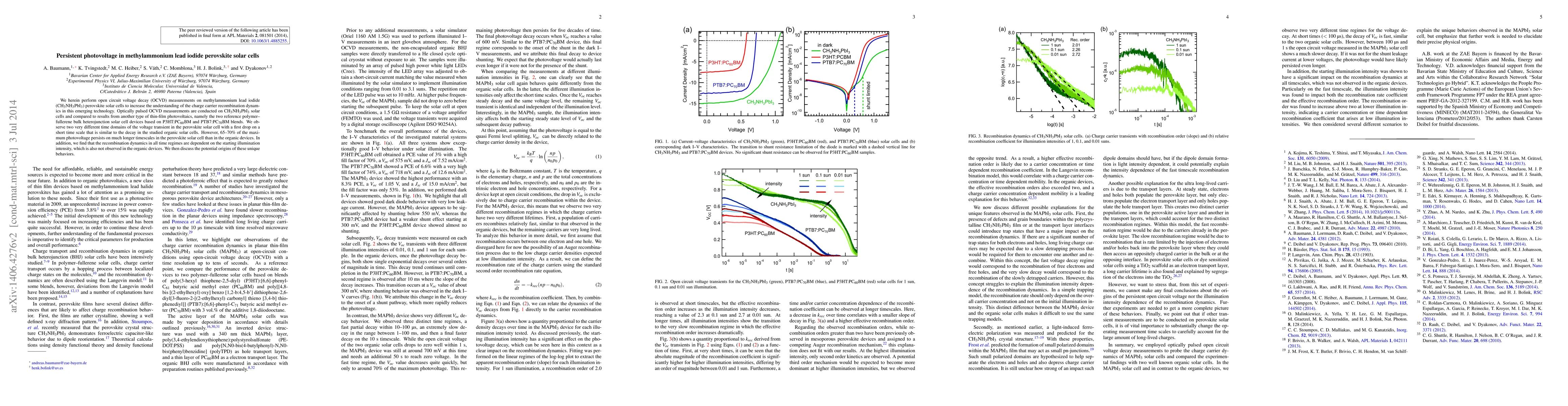 This study investigates the charge carrier recombination dynamics in methylammonium lead iodide perovskite solar cells, revealing two distinct voltage decay time domains and significant persistent photovoltage compared to organic solar cells, with recombination dynamics also dependent on illumination intensity.