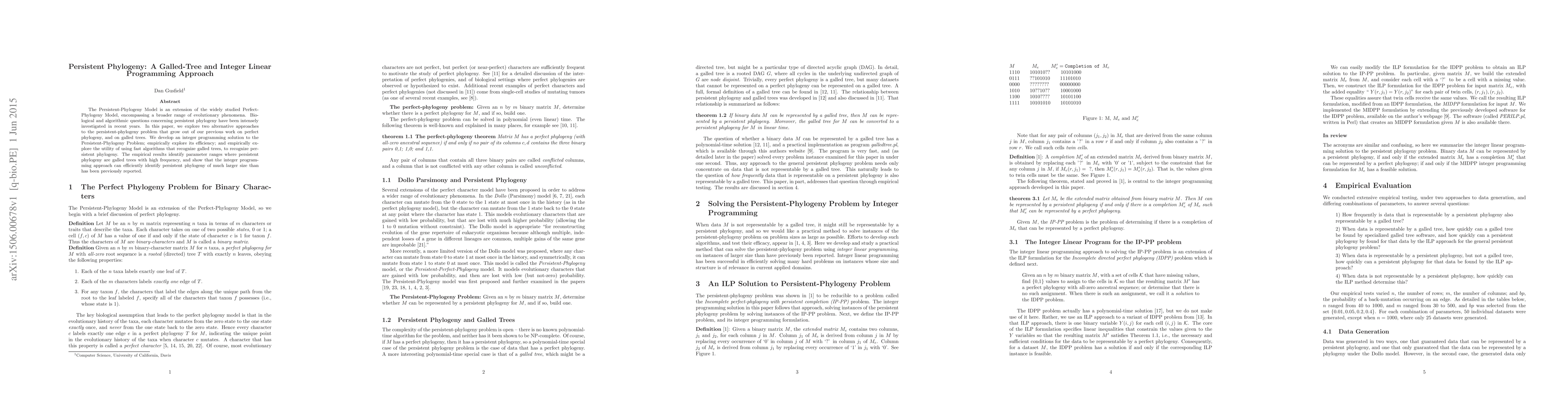 This paper extends the Perfect-Phylogeny Model to the Persistent-Phylogeny Model, developing an integer programming solution and exploring galled-tree algorithms for efficient recognition. Empirical results reveal the frequency of galled trees within persistent phylogenies and demonstrate the superior scalability of the integer programming approach.