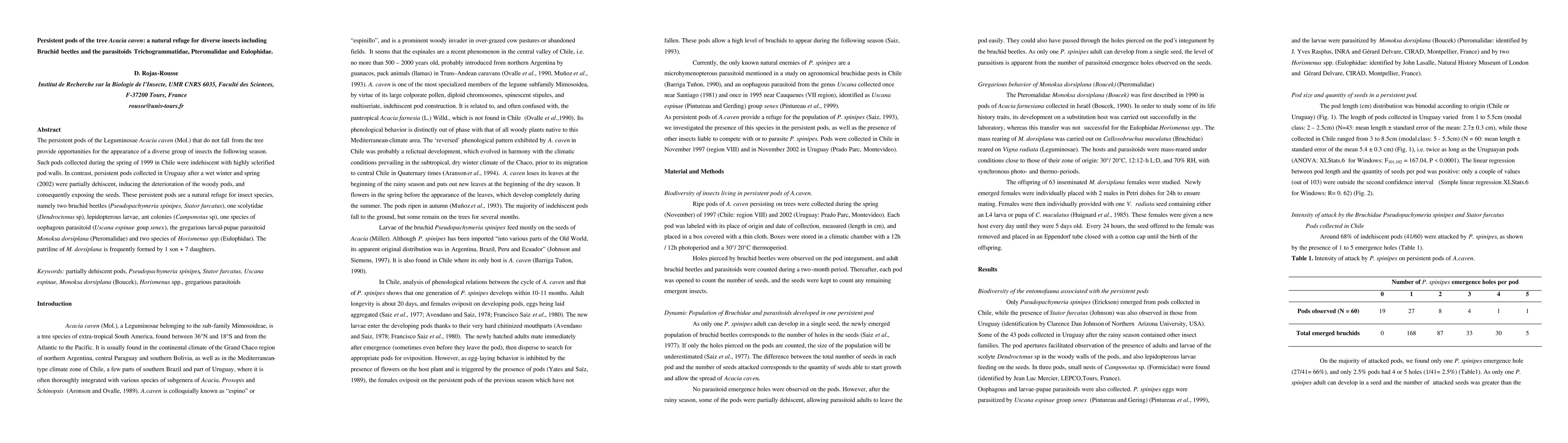 The persistent pods of the tree, Acacia caven, that do not fall from the tree provide opportunities for the appearance of a diverse group of insects the following season. Such pods collected during the spring of 1999 in Chile were indehiscent with highly sclerified pod walls. In contrast, persistent pods collected in Uruguay after a wet winter and spring (2002) were partially dehiscent, inducing the deterioration of the woody pods, and consequently exposing the seeds. These persistent pods are a natural refuge for insect species, namely two bruchid beetles (Pseudopachymeria spinipes, Stator furcatus), one scolytidae (Dendroctonus sp), lepidopterous larvae, ant colonies (Camponotus sp),one species of oophagous parasitoid (Uscana espinae group senex), the gregarious larval-pupae parasitoid Monoksa dorsiplana (Pteromalidae) and two species of Horismenus spp. (Eulophidae). The patriline of M. dorsiplana is frequently formed by 1 son +7 daughters.