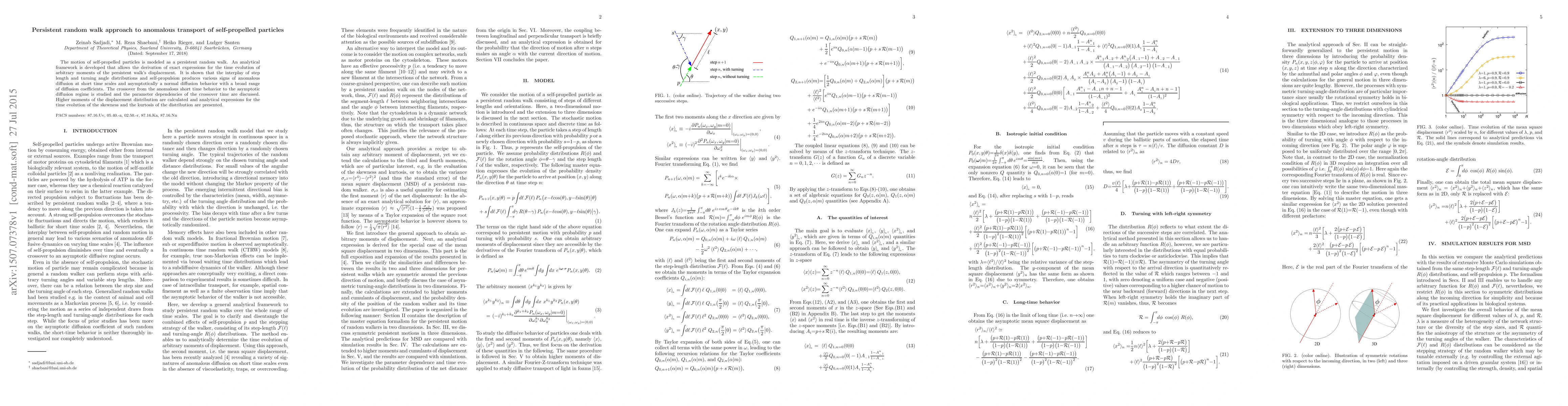 This paper develops an analytical framework for modeling self-propelled particles' motion as a persistent random walk, deriving exact expressions for the time evolution of displacement moments. It reveals anomalous diffusion at short times transitioning to normal diffusion, with a range of diffusion coefficients, and analyzes the crossover time's parameter dependencies.