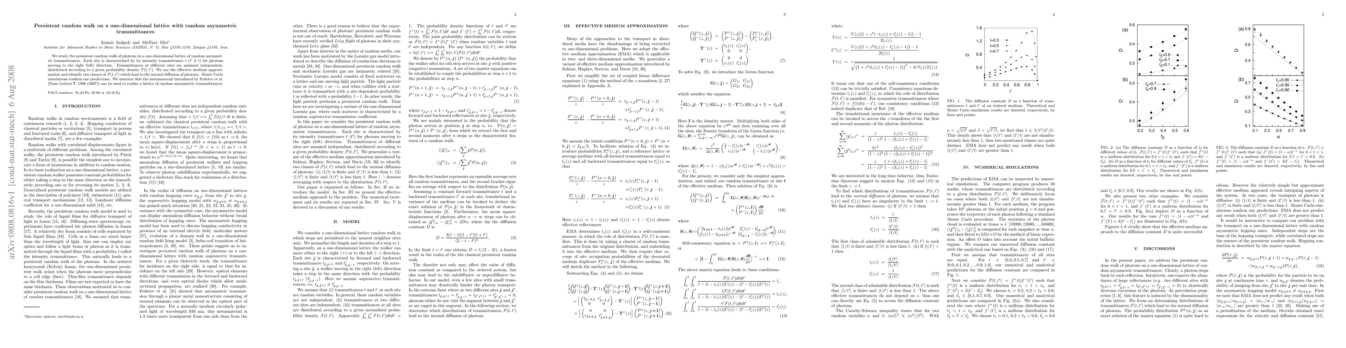 This paper investigates the persistent random walk of photons on a one-dimensional lattice with random asymmetric transmittances, identifying two classes of transmittance distributions that result in normal diffusion, verified by Monte Carlo simulations.