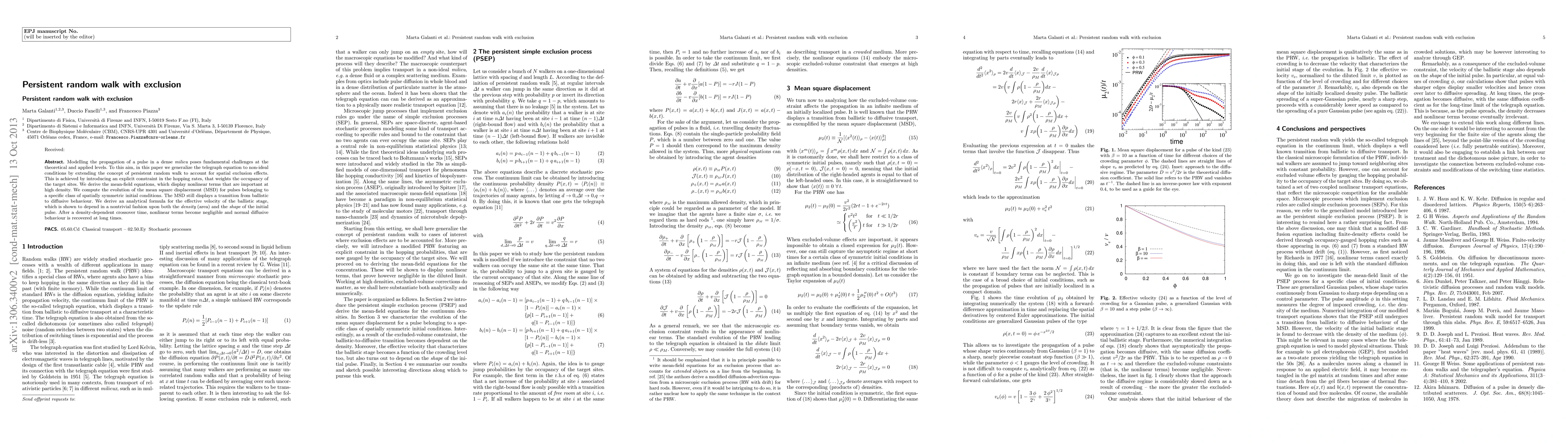 Modelling the propagation of a pulse in a dense {\em milieu} poses fundamental challenges at the theoretical and applied levels. To this aim, in this paper we generalize the telegraph equation to non-ideal conditions by extending the concept of persistent random walk to account for spatial exclusion effects. This is achieved by introducing an explicit constraint in the hopping rates, that weights the occupancy of the target sites. We derive the mean-field equations, which display nonlinear terms that are important at high density. We compute the evolution of the mean square displacement (MSD) for pulses belonging to a specific class of spatially symmetric initial conditions. The MSD still displays a transition from ballistic to diffusive behaviour. We derive an analytical formula for the effective velocity of the ballistic stage, which is shown to depend in a nontrivial fashion upon both the density (area) and the shape of the initial pulse. After a density-dependent crossover time, nonlinear terms become negligible and normal diffusive behaviour is recovered at long times.
