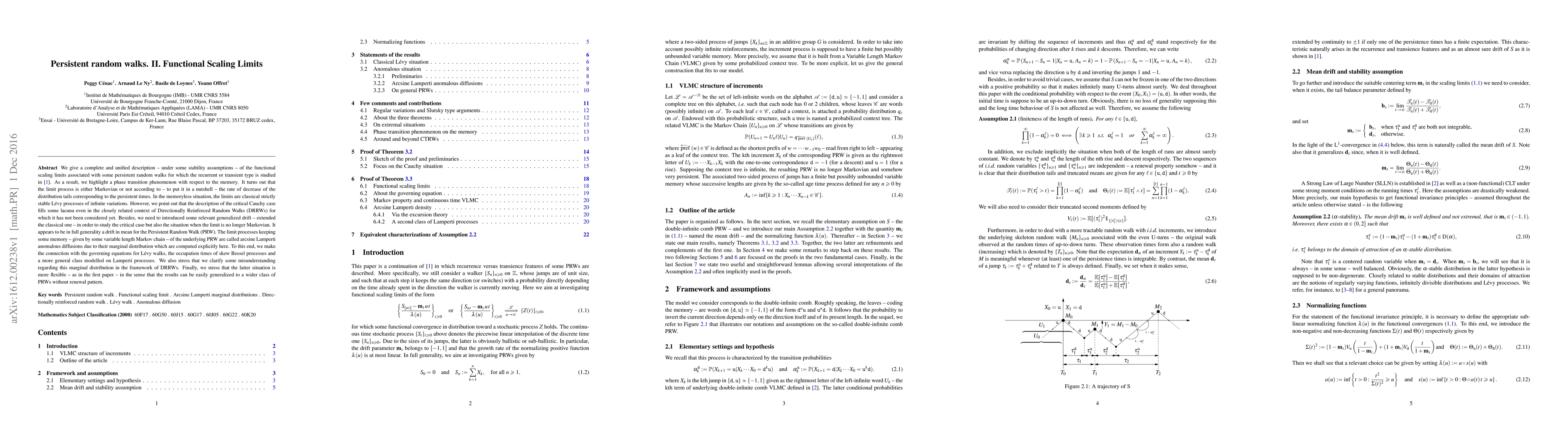 We give a complete and unified description -- under some stability assumptions -- of the functional scaling limits associated with some persistent random walks for which the recurrent or transient type is studied in [1]. As a result, we highlight a phase transition phenomenon with respect to the memory. It turns out that the limit process is either Markovian or not according to -- to put it in a nutshell -- the rate of decrease of the distribution tails corresponding to the persistent times. In the memoryless situation, the limits are classical strictly stable L{\'e}vy processes of infinite variations. However, we point out that the description of the critical Cauchy case fills some lacuna even in the closely related context of Directionally Reinforced Random Walks (DRRWs) for which it has not been considered yet. Besides, we need to introduced some relevant generalized drift -- extended the classical one -- in order to study the critical case but also the situation when the limit is no longer Markovian. It appears to be in full generality a drift in mean for the Persistent Random Walk (PRW). The limit processes keeping some memory -- given by some variable length Markov chain -- of the underlying PRW are called arcsine Lamperti anomalous diffusions due to their marginal distribution which are computed explicitly here. To this end, we make the connection with the governing equations for L{\'e}vy walks, the occupation times of skew Bessel processes and a more general class modelled on Lamperti processes. We also stress that we clarify some misunderstanding regarding this marginal distribution in the framework of DRRWs. Finally, we stress that the latter situation is more flexible -- as in the first paper -- in the sense that the results can be easily generalized to a wider class of PRWs without renewal pattern.