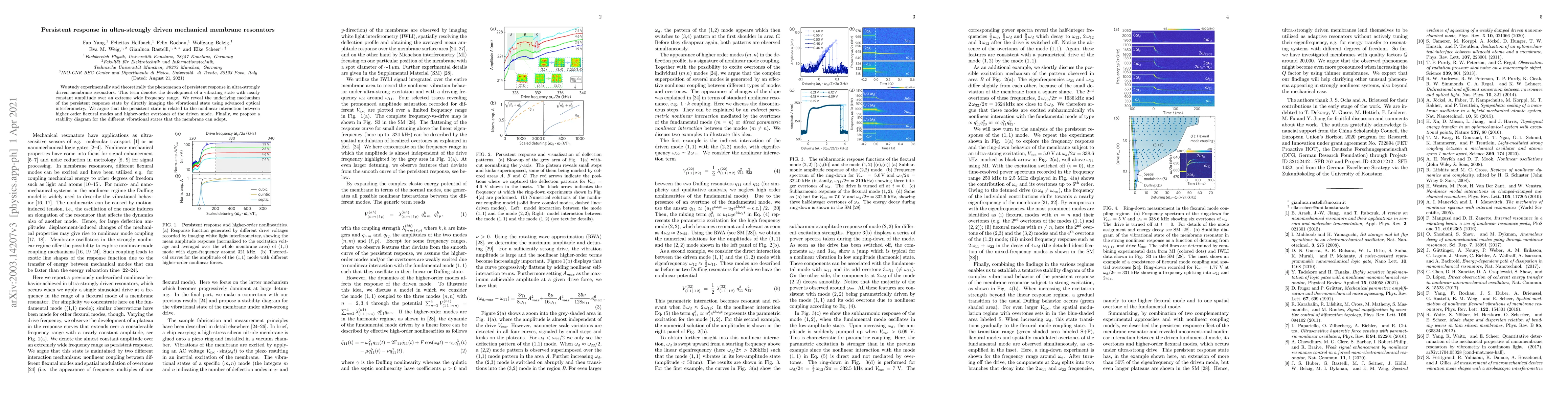 This paper investigates the phenomenon of persistent response in ultra-strongly driven mechanical membrane resonators, characterized by a vibrating state with constant amplitude across a wide frequency range. The study reveals the mechanism behind this behavior through advanced optical interferometry and proposes a stability diagram for the various vibrational states.