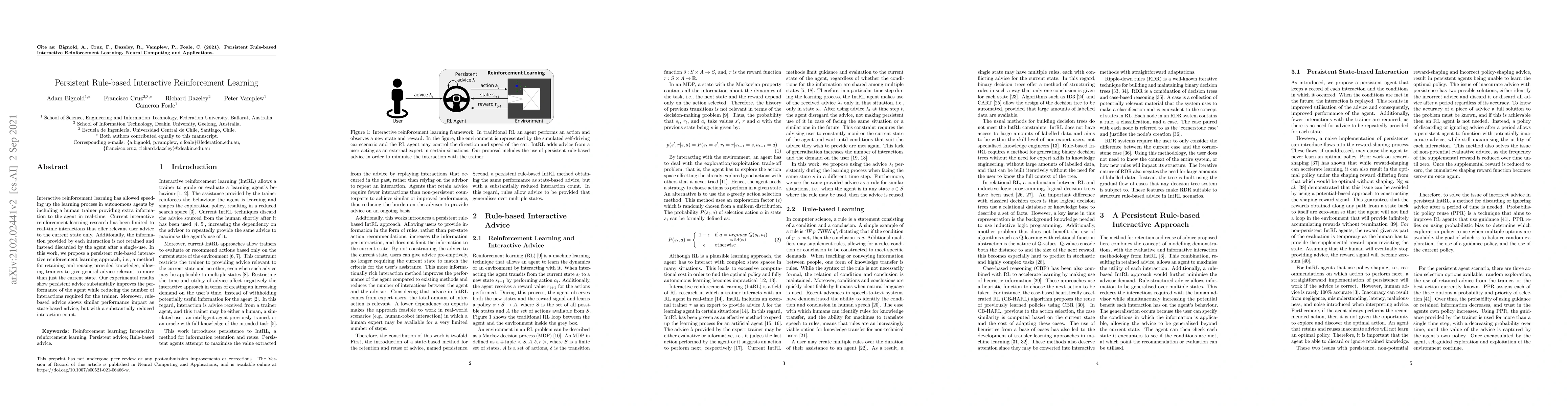 This paper proposes a persistent rule-based interactive reinforcement learning approach that retains and reuses trainer advice, allowing for general guidance beyond the current state. Experimental results demonstrate that this method improves agent performance and reduces the number of required interactions compared to state-specific advice.